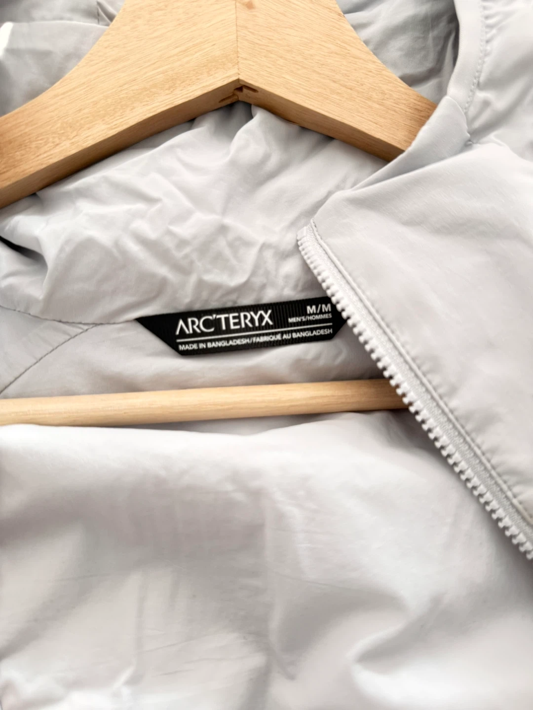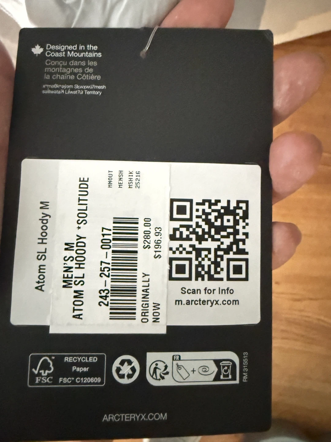 Selling an Arc'teryx Atom SL Hoody in men's size M. The original price was $280. It's a lightweight hoody perfect for layering or wearing on its own. The color is a versatile light gray.