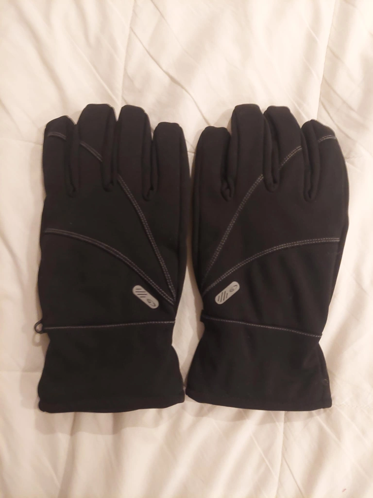 Pair of men's black fleece gloves. Size XL. 100% polyester. Made in China. Features zipper closure.