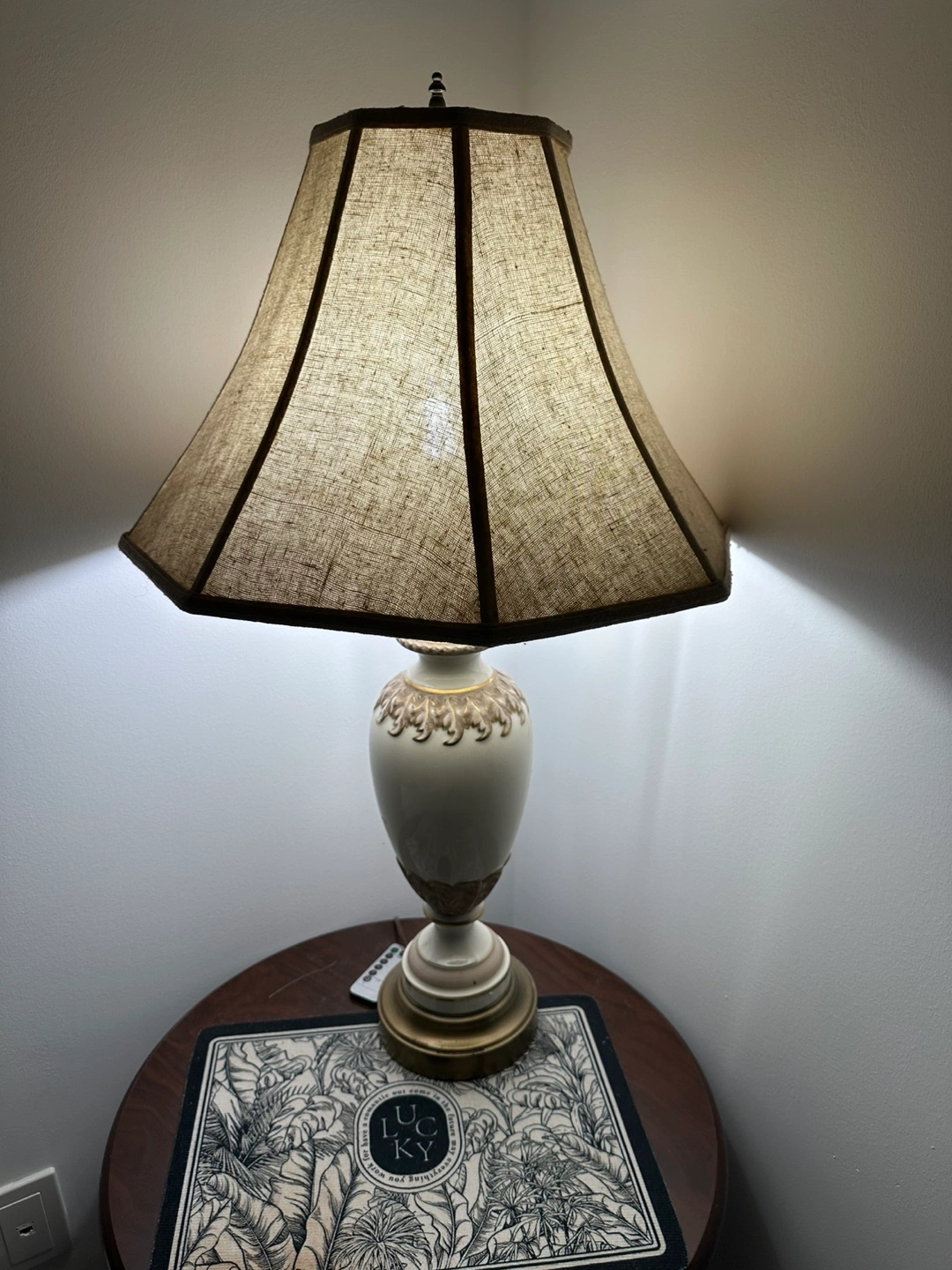 Beautiful table lamp, beige fabric shade, ornate ceramic base. Gold accents. Perfect for a bedside table or living room. Includes bulb.
