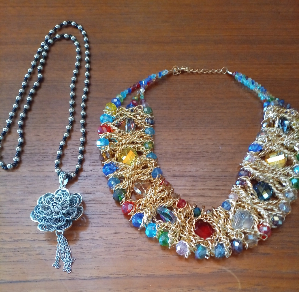 Two necklaces. One features silver-toned beads and a floral pendant. The other is a statement piece with gold-toned wire and colourful crystals. Each $5, pick up only. Please see my other listings.