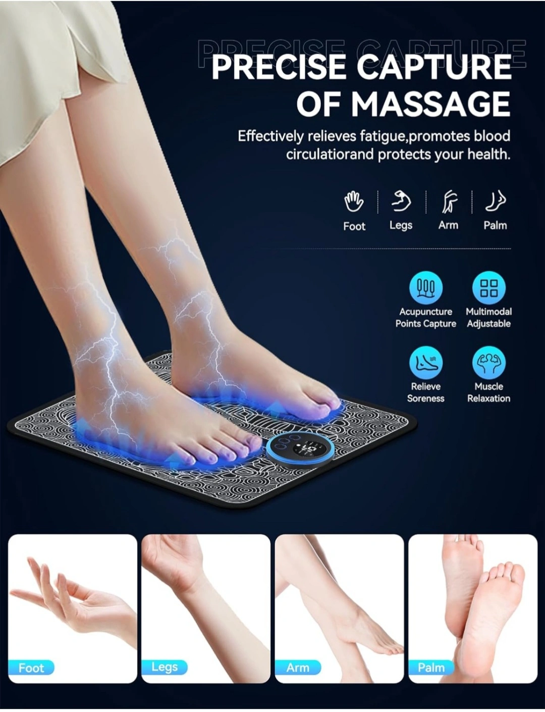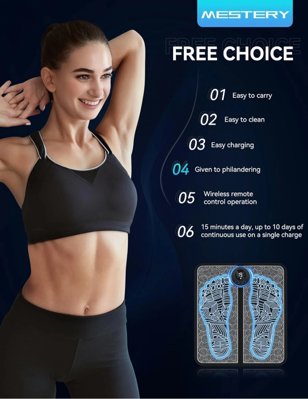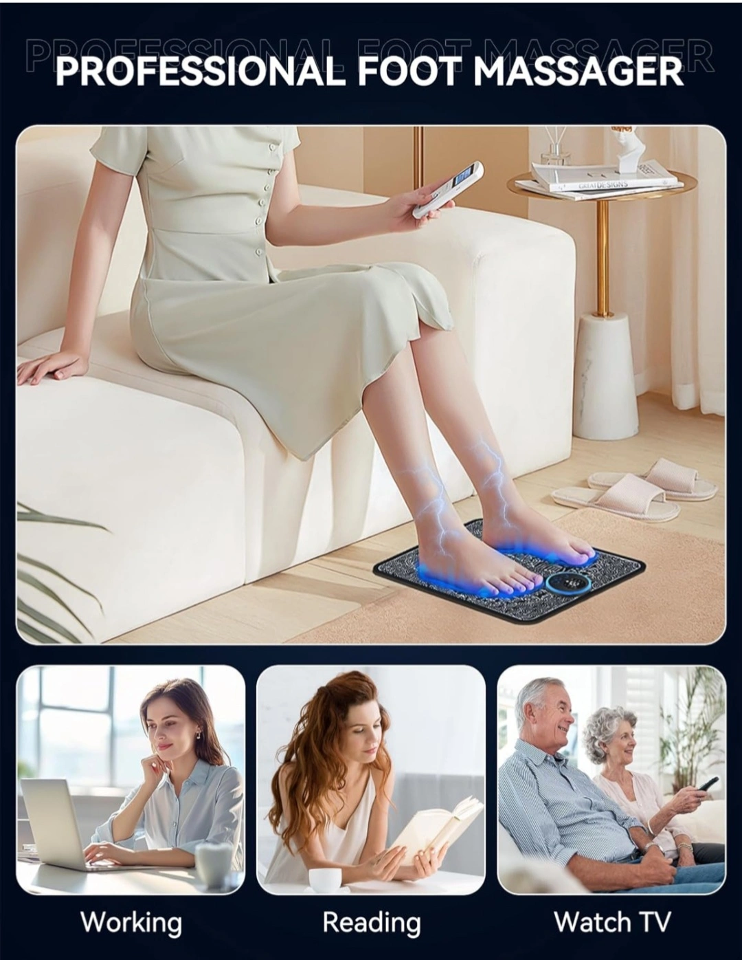 Electric muscle stimulation foot massager. Relieves muscle soreness and promotes blood circulation. Multimodal adjustable intensity. Wireless remote control. Easy to clean and carry. Great for plantar fasciitis, muscle stiffness, and relieving work fatigue.