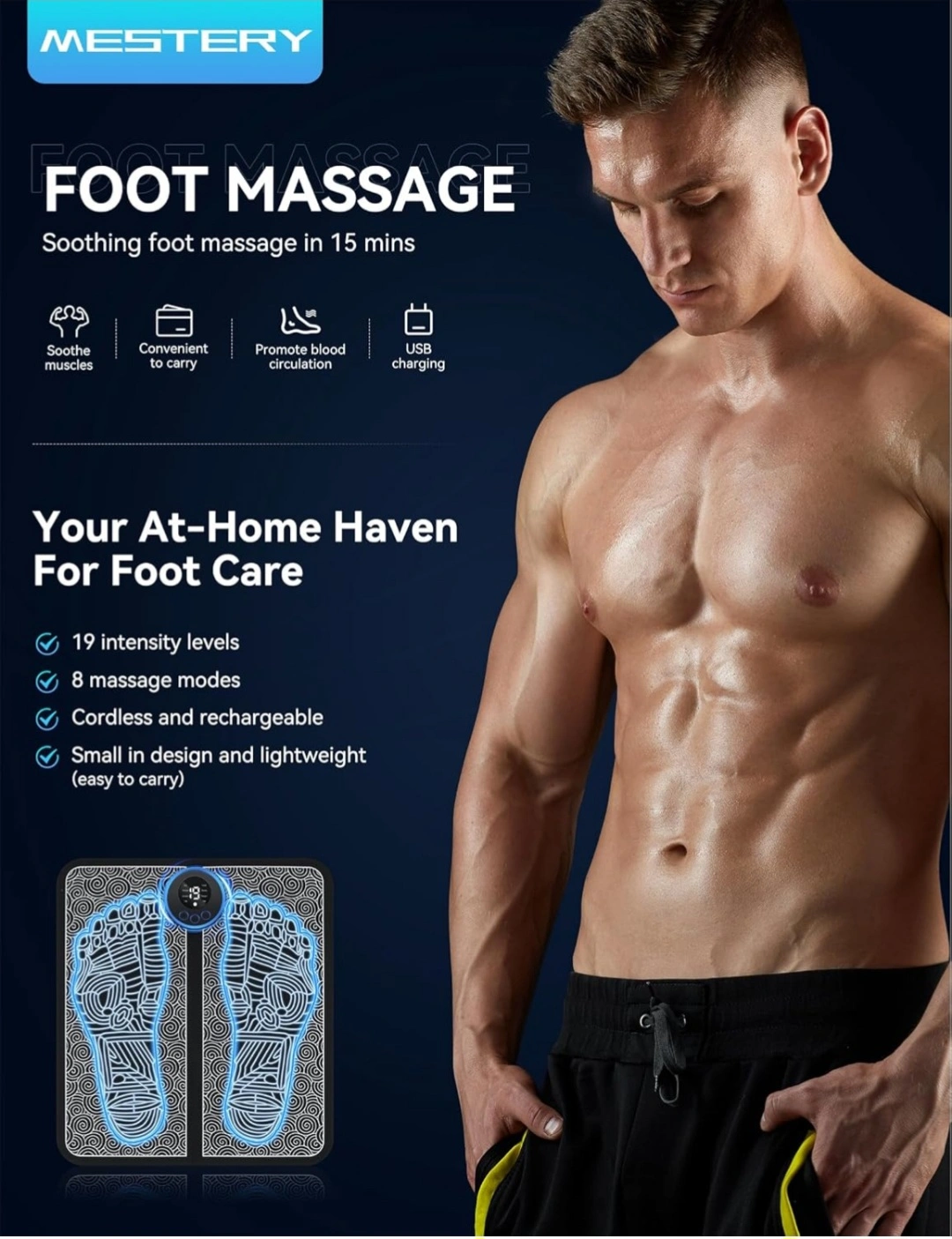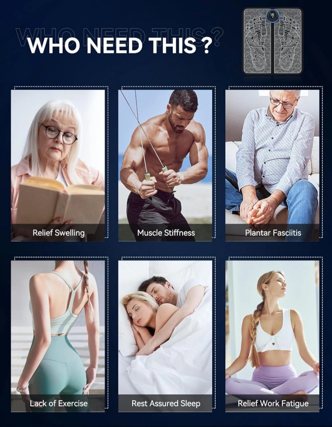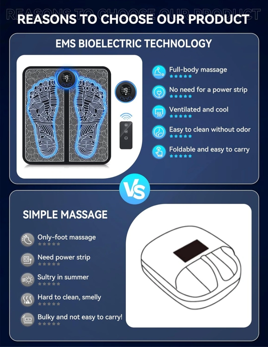 Electric muscle stimulation foot massager. Relieves muscle soreness and promotes blood circulation. Multimodal adjustable intensity. Wireless remote control. Easy to clean and carry. Great for plantar fasciitis, muscle stiffness, and relieving work fatigue.