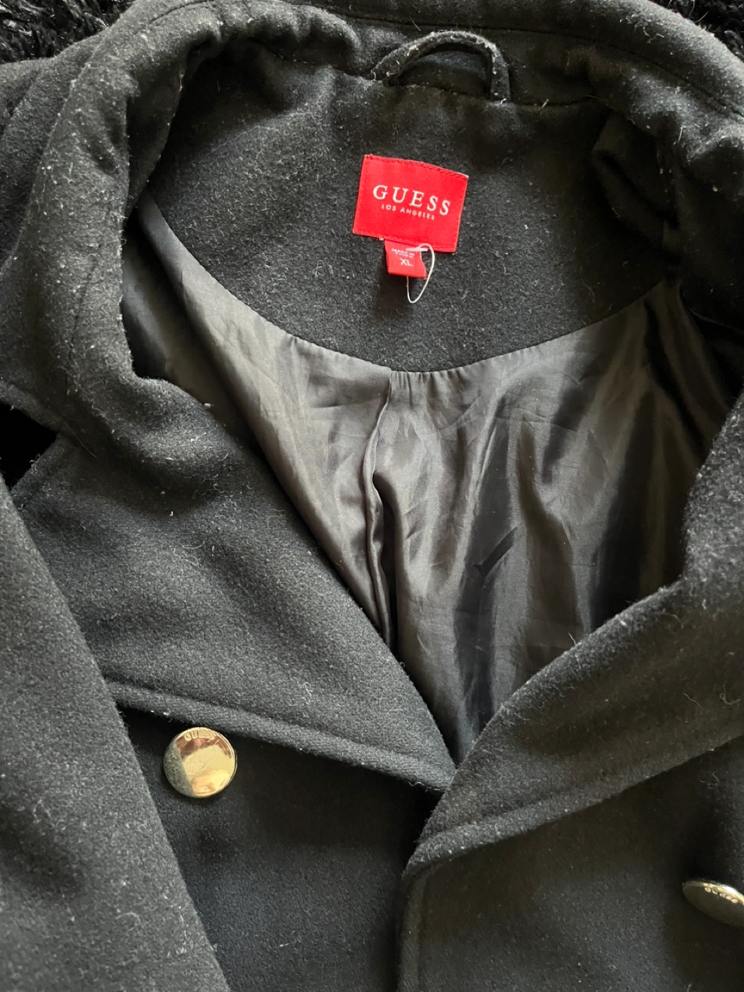 Women's black peacoat. Double-breasted, gold buttons. Side zip pockets. Classic style, great for colder weather.