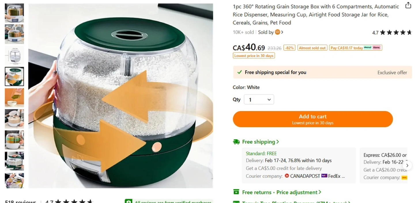 Automatic rice dispenser, airtight food storage for rice, cereals, grains, pet food. Six compartments. Rotating design.
