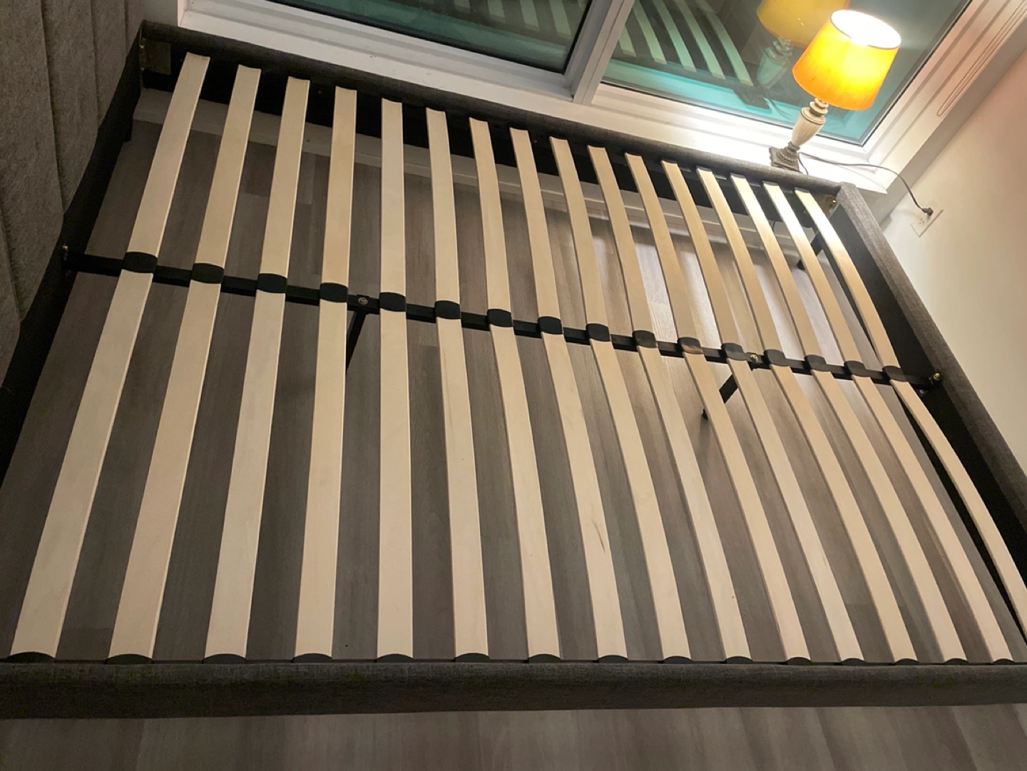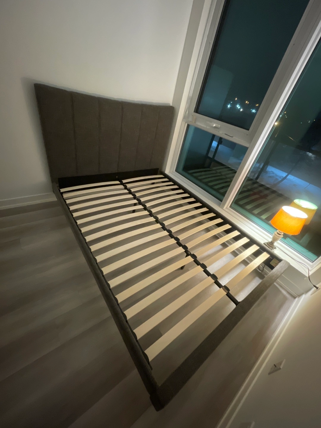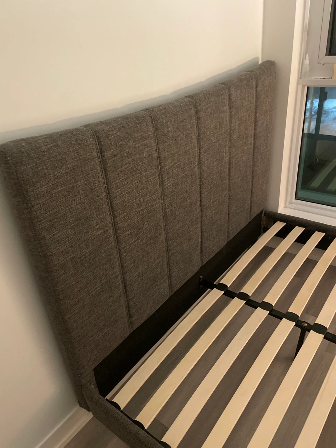 Queen-size bed frame. Grey fabric headboard. Wooden slats included. Minimal assembly required.