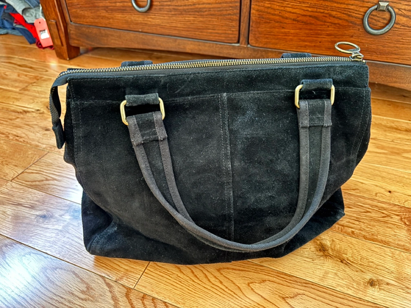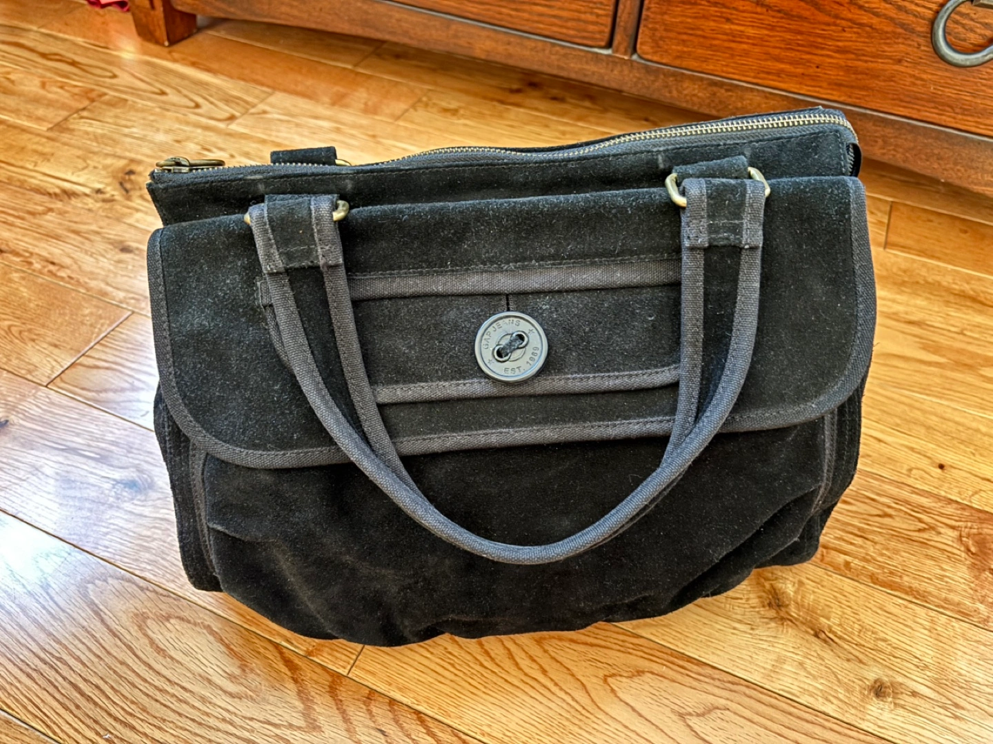 Ladies Gap Black Suede Handbag..in great condition..has a front pocket and a pocket on the inside..zippered closure..approx. 17"wide x 11" tall..