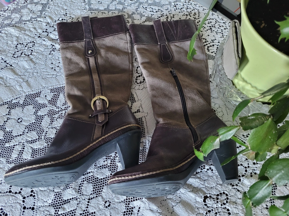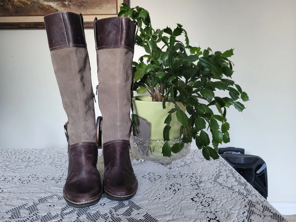 Pair of women's knee-high boots. Brown leather and taupe suede upper. Block heel. Side zipper. Decorative buckle detail. Pre-owned.