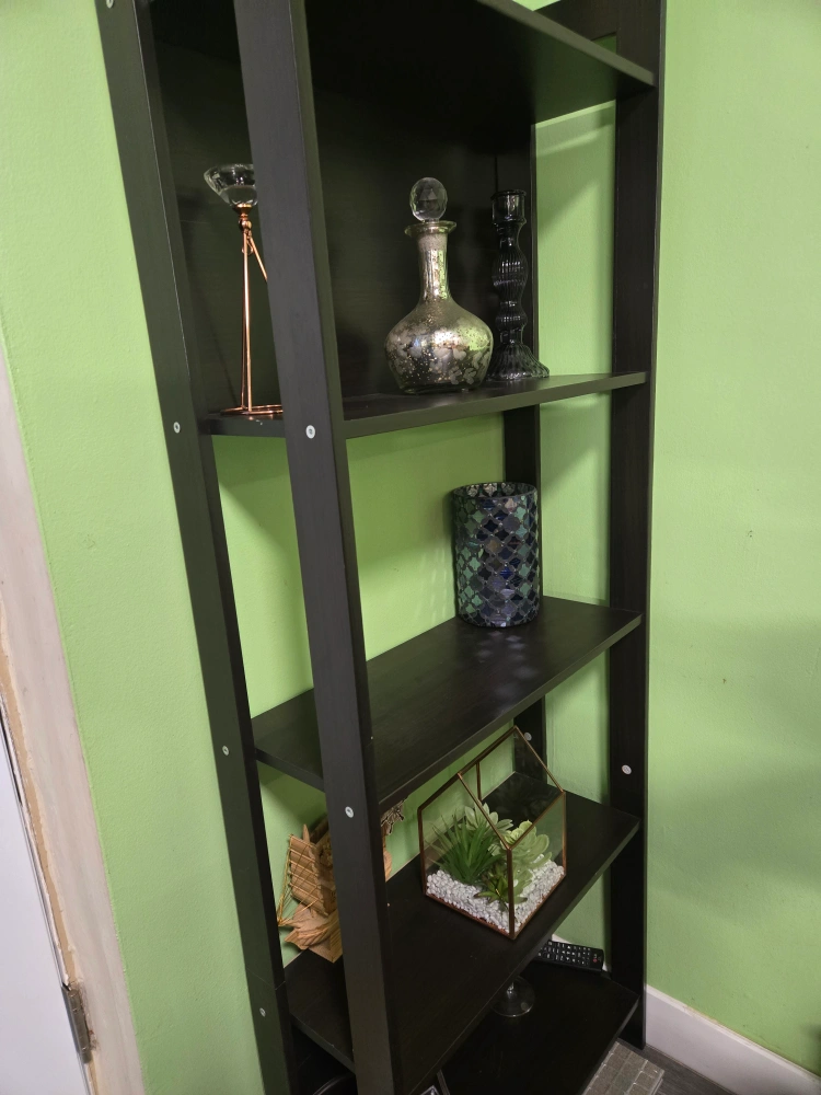 Five-shelf dark brown bookcase. Narrow and tall. Great for smaller spaces. Some assembly required.wall mounted