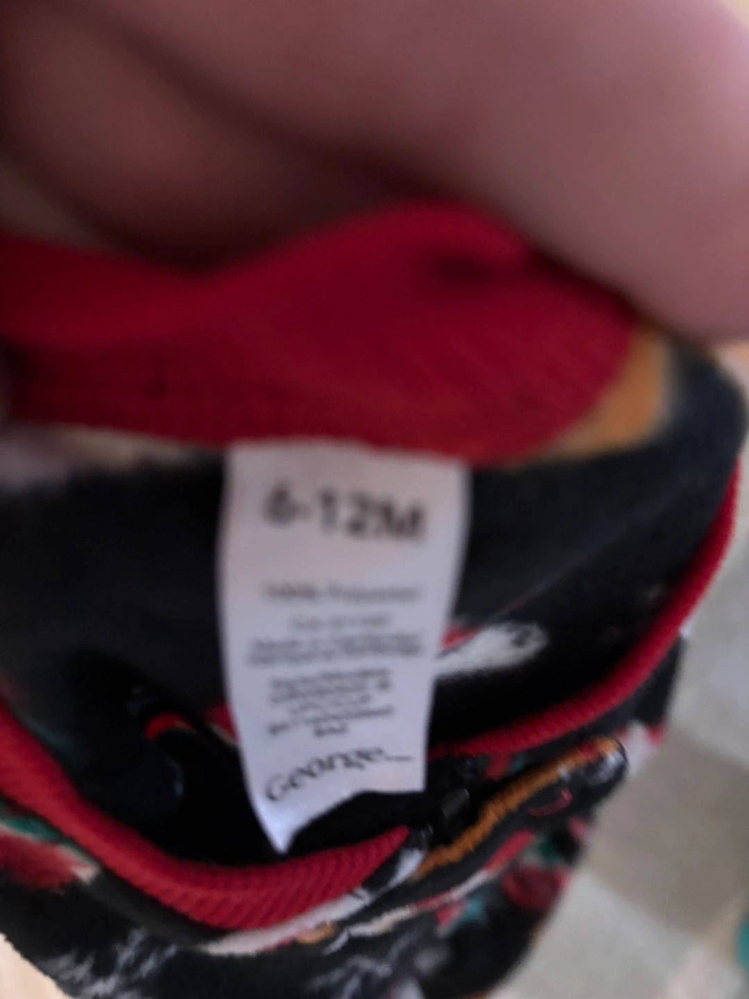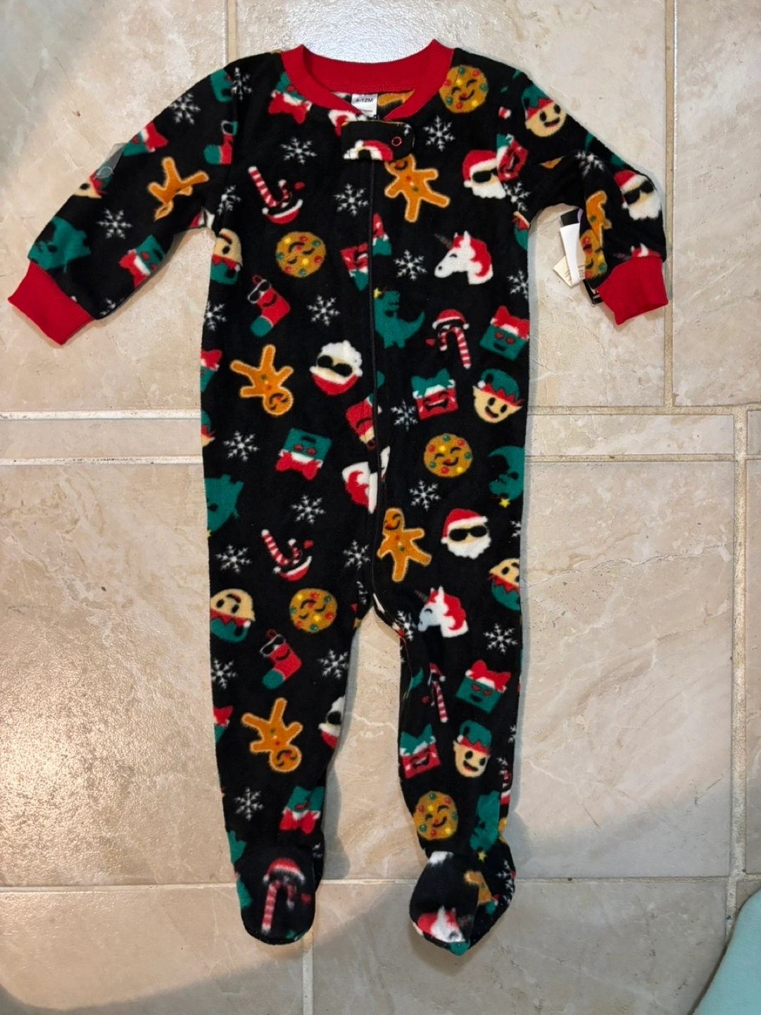 Adorable Carter's Christmas pajamas. Size 6-12 months. Black fleece with colourful Christmas designs. Full zip closure. Features a festive red pocket with the phrase "Full of Holiday Spirit". New with tags.