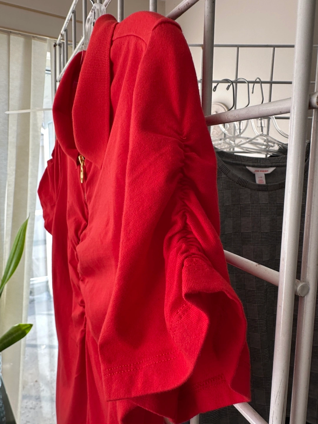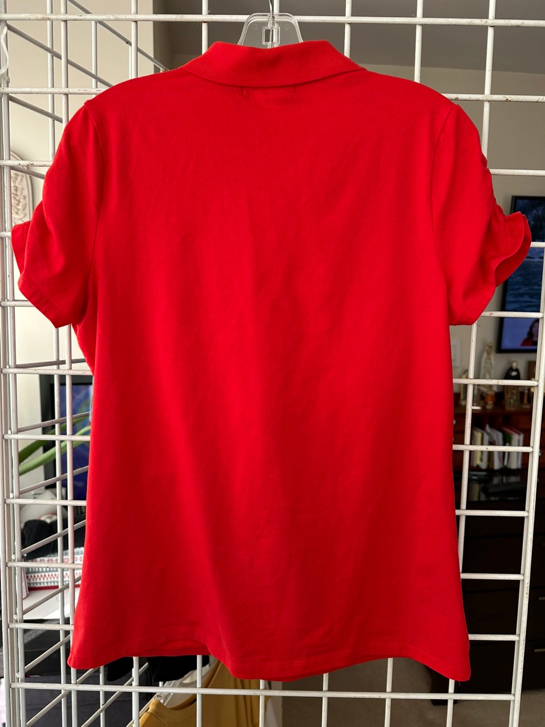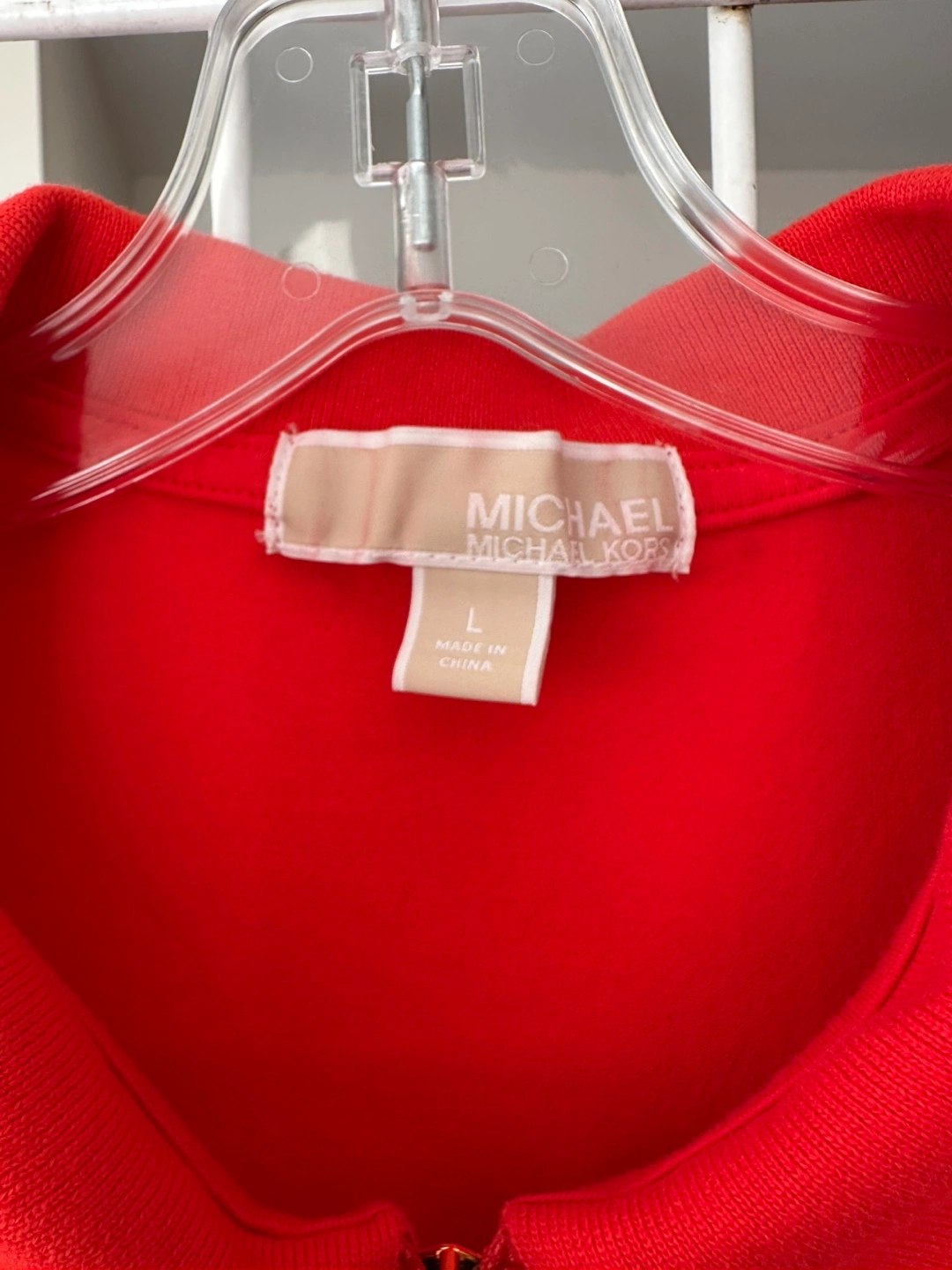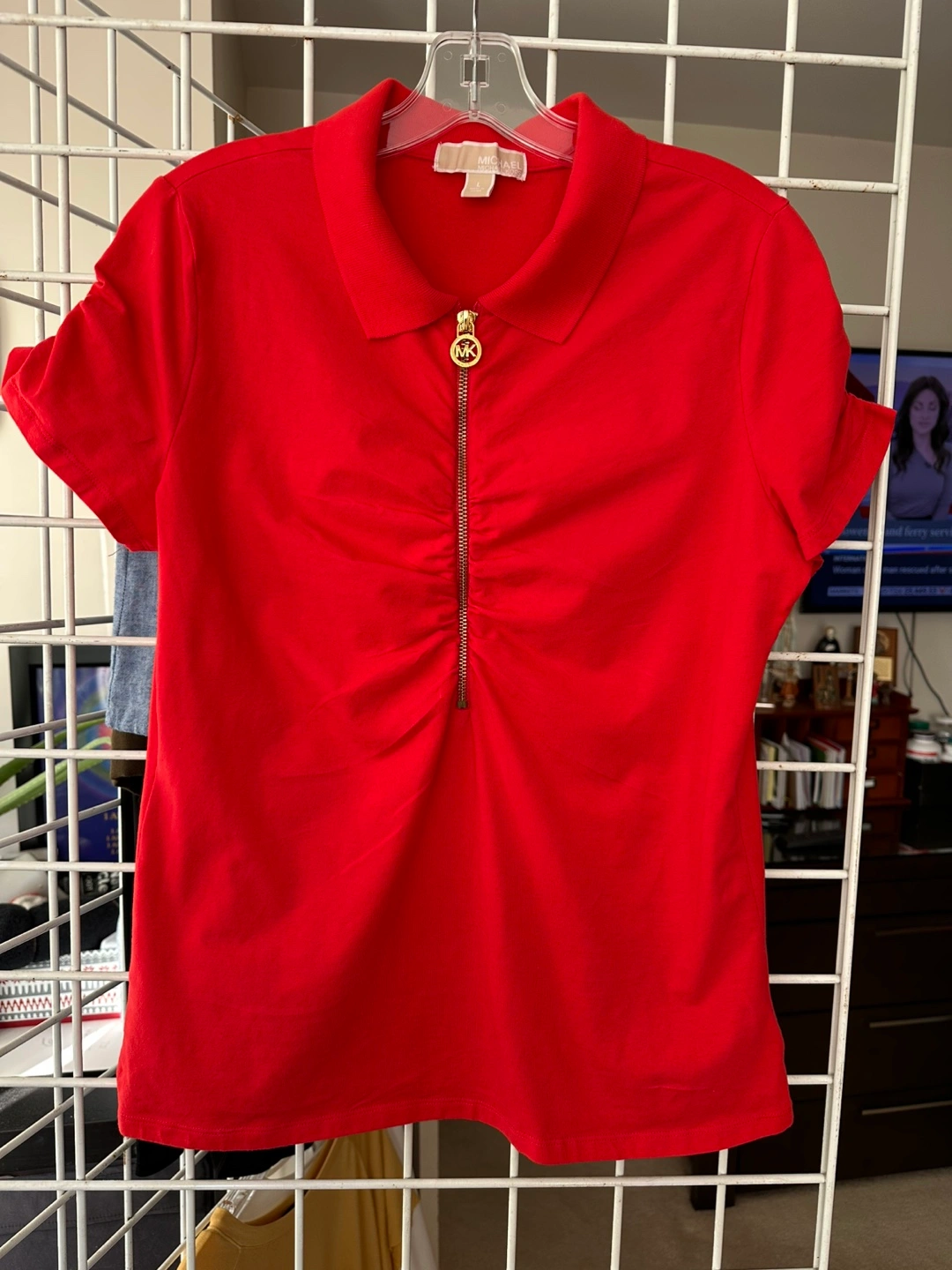 Women's red short-sleeve collared shirt. Features a gold zipper and MK logo. Size large. Made in China.