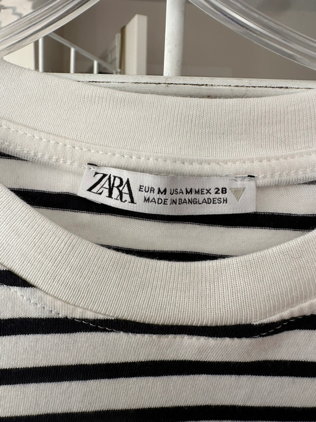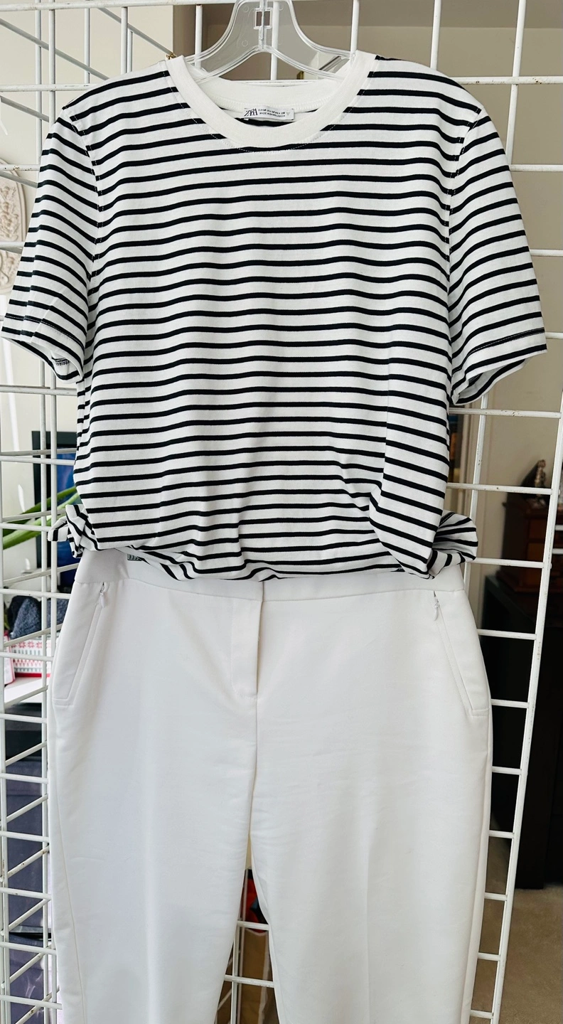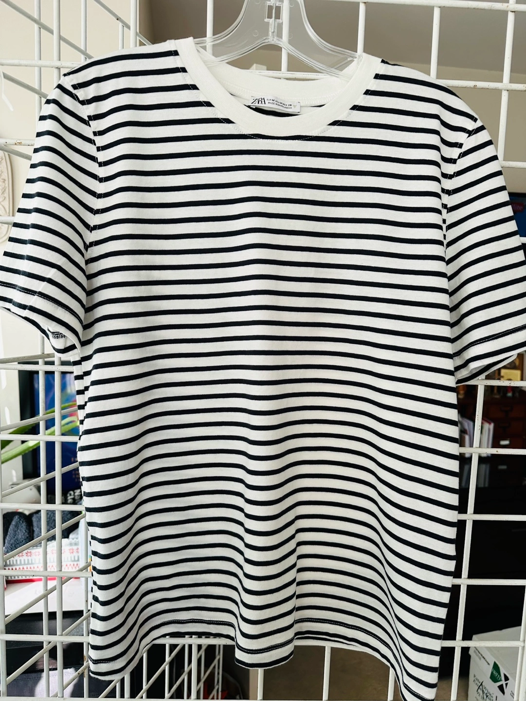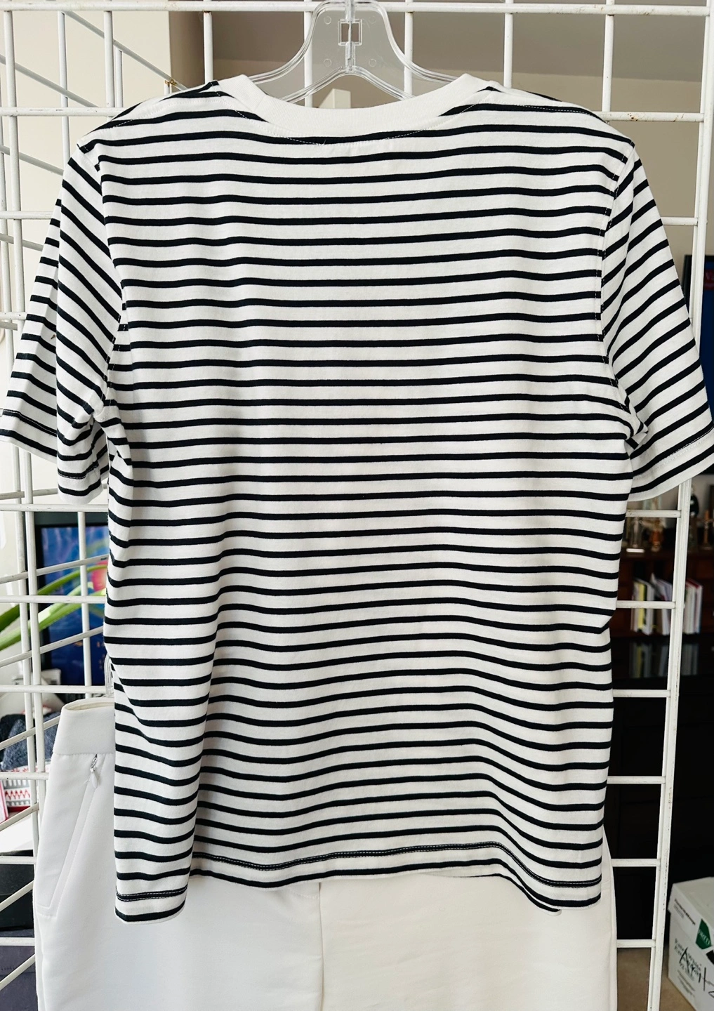 Women's navy and white striped short sleeve shirt. Size Medium. Made in Bangladesh.