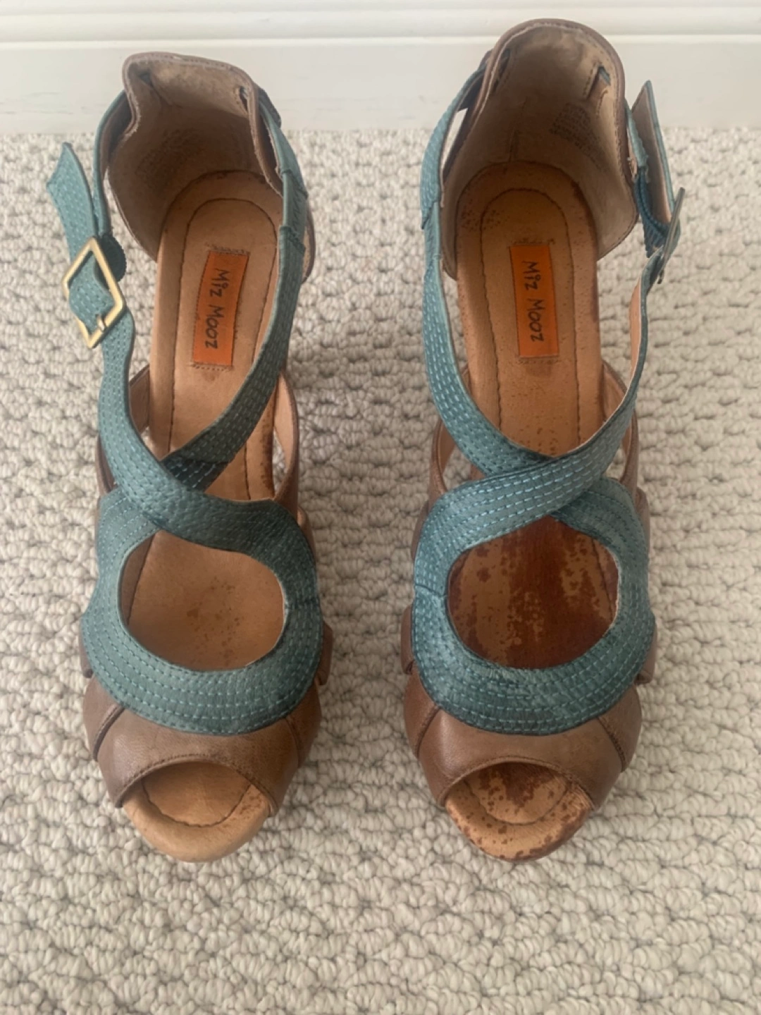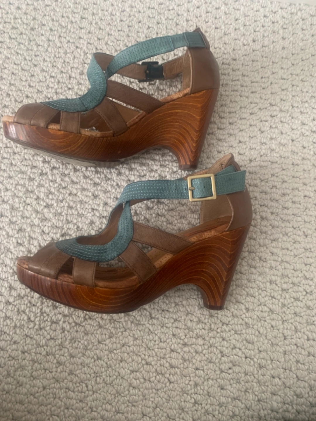 Women's leather wedge sandals. Brown and teal leather upper. Wooden wedge heel. Ankle strap closure. Open toe.