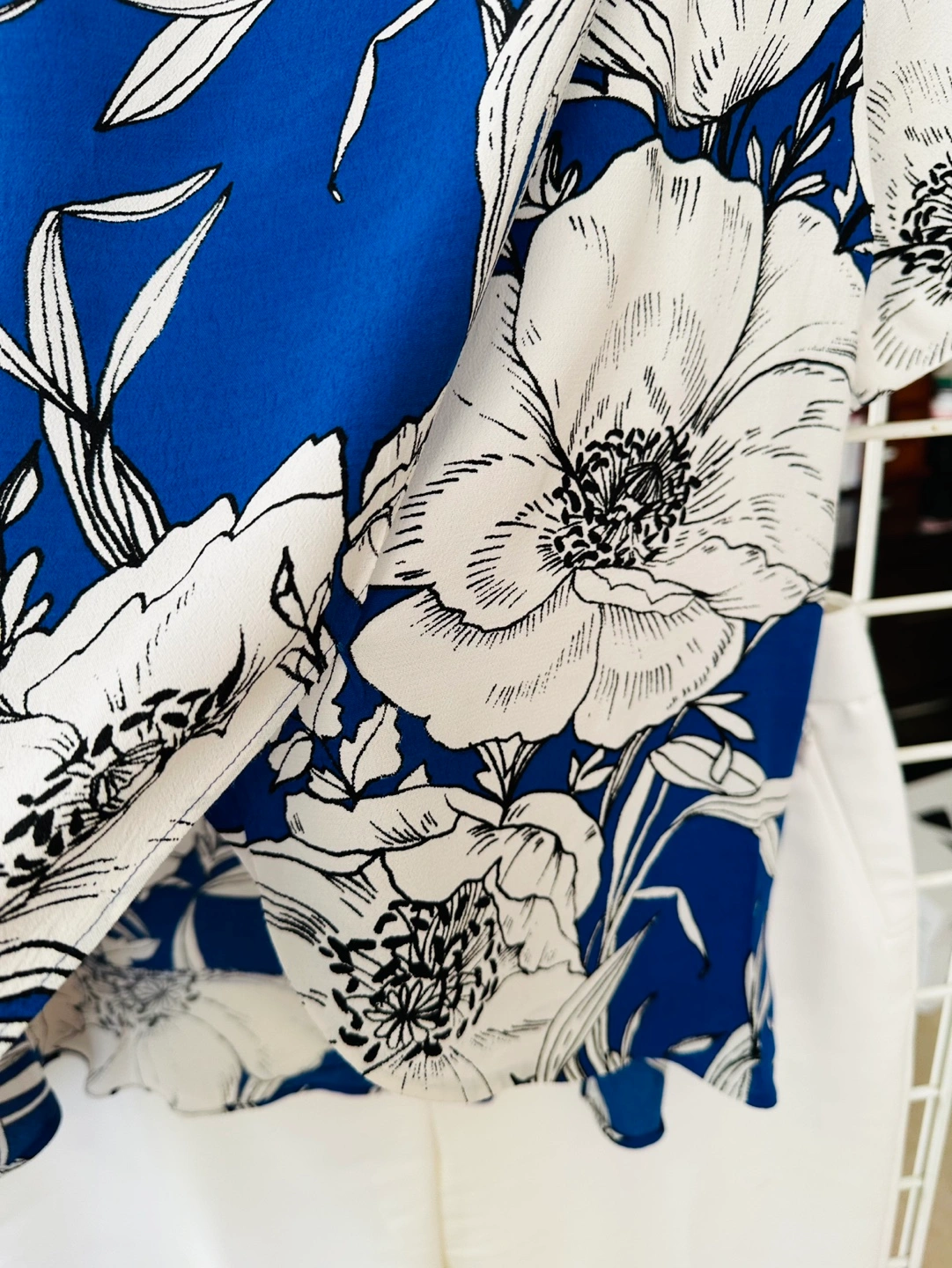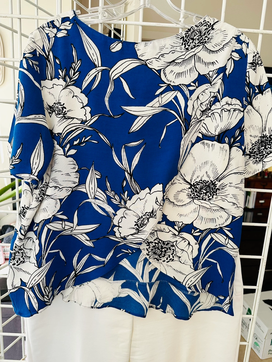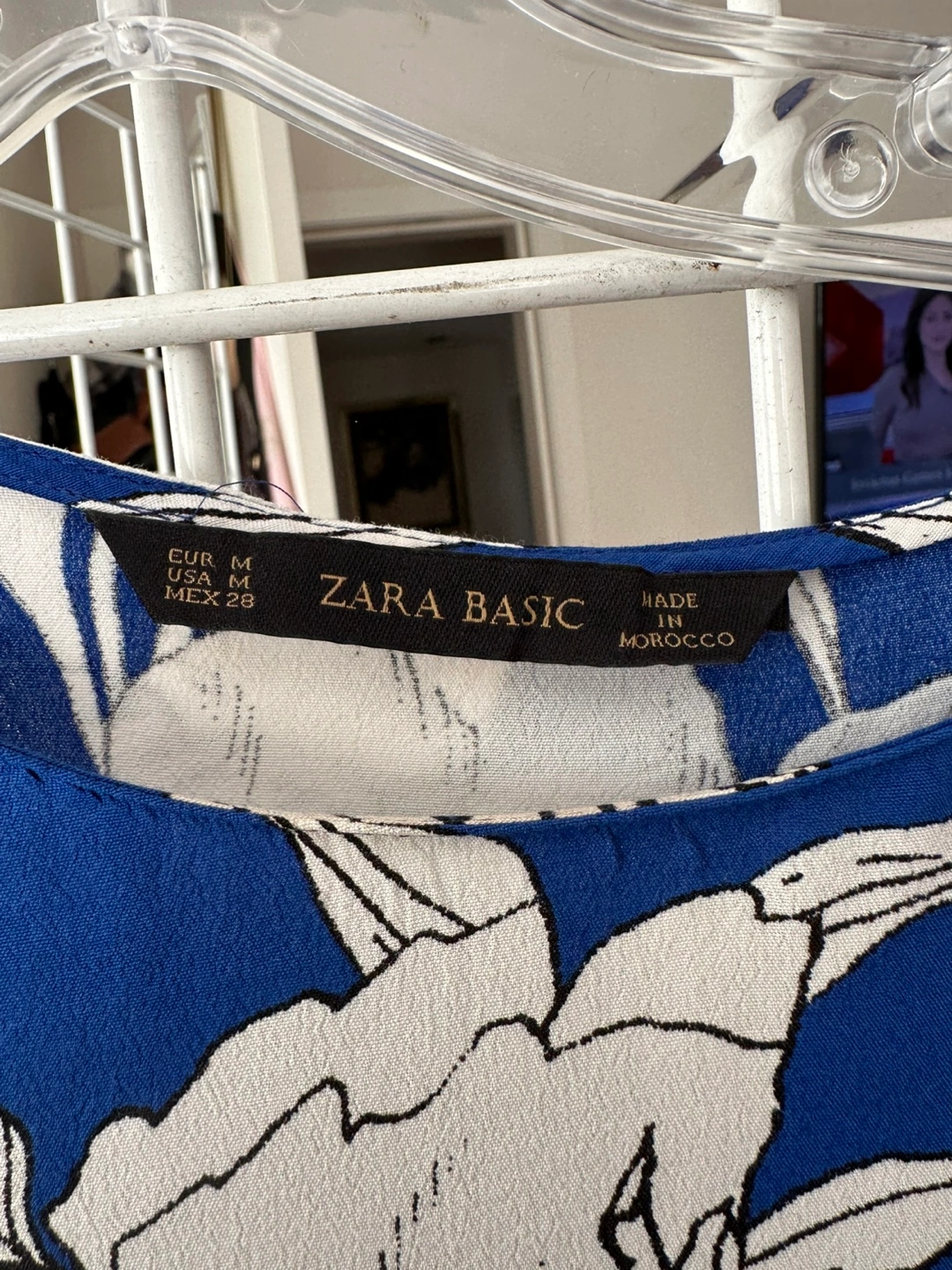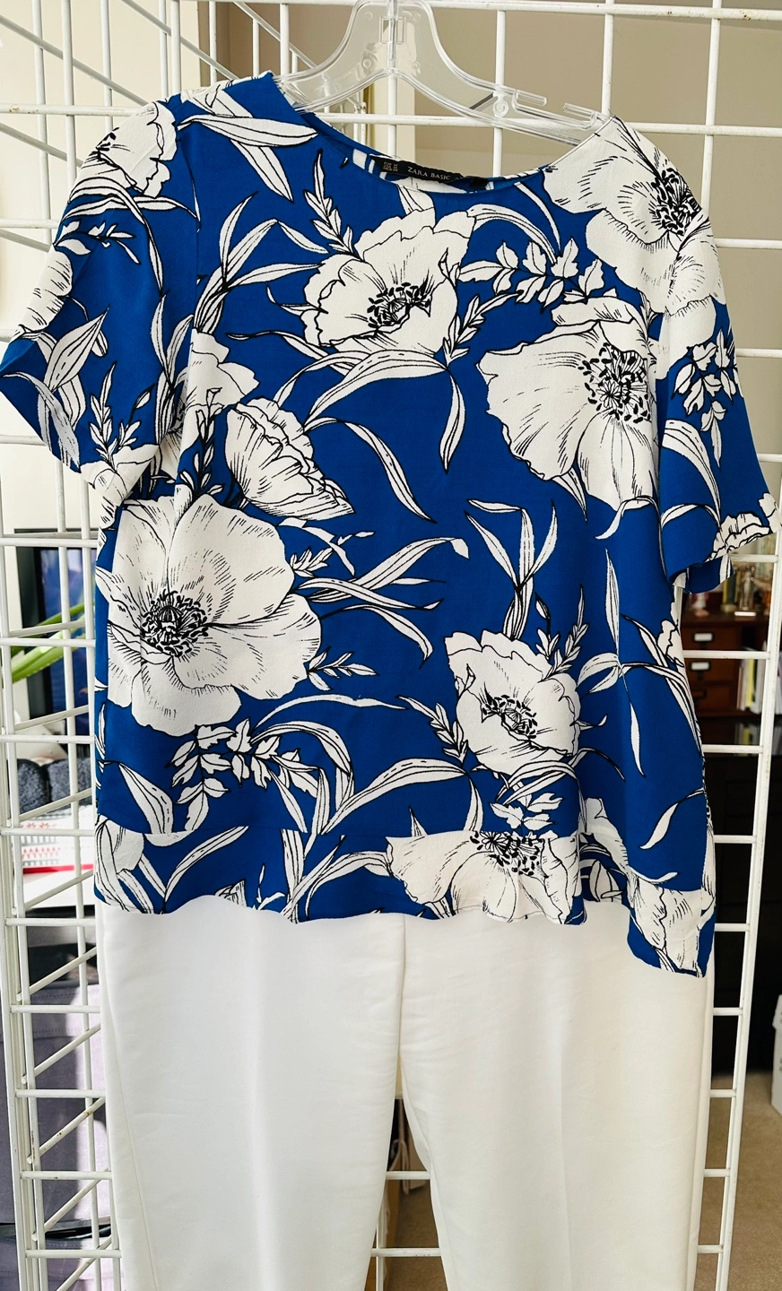 Women's Zara Basic blouse. Size Medium. Blue floral pattern. Short sleeves. Great for spring or summer.