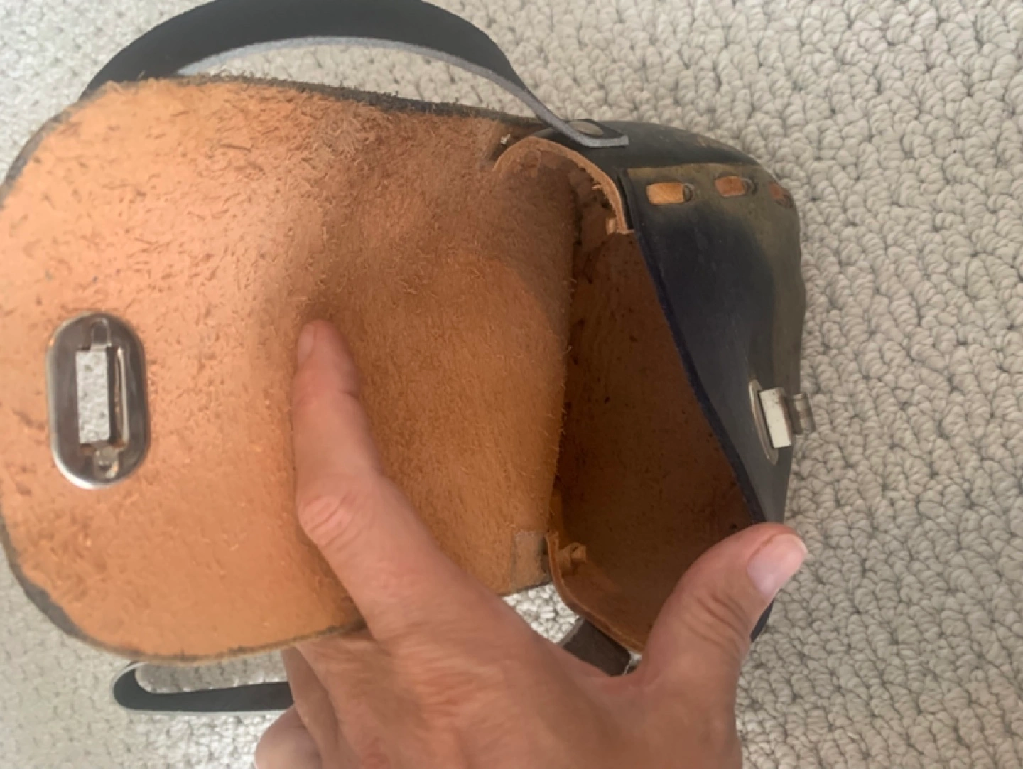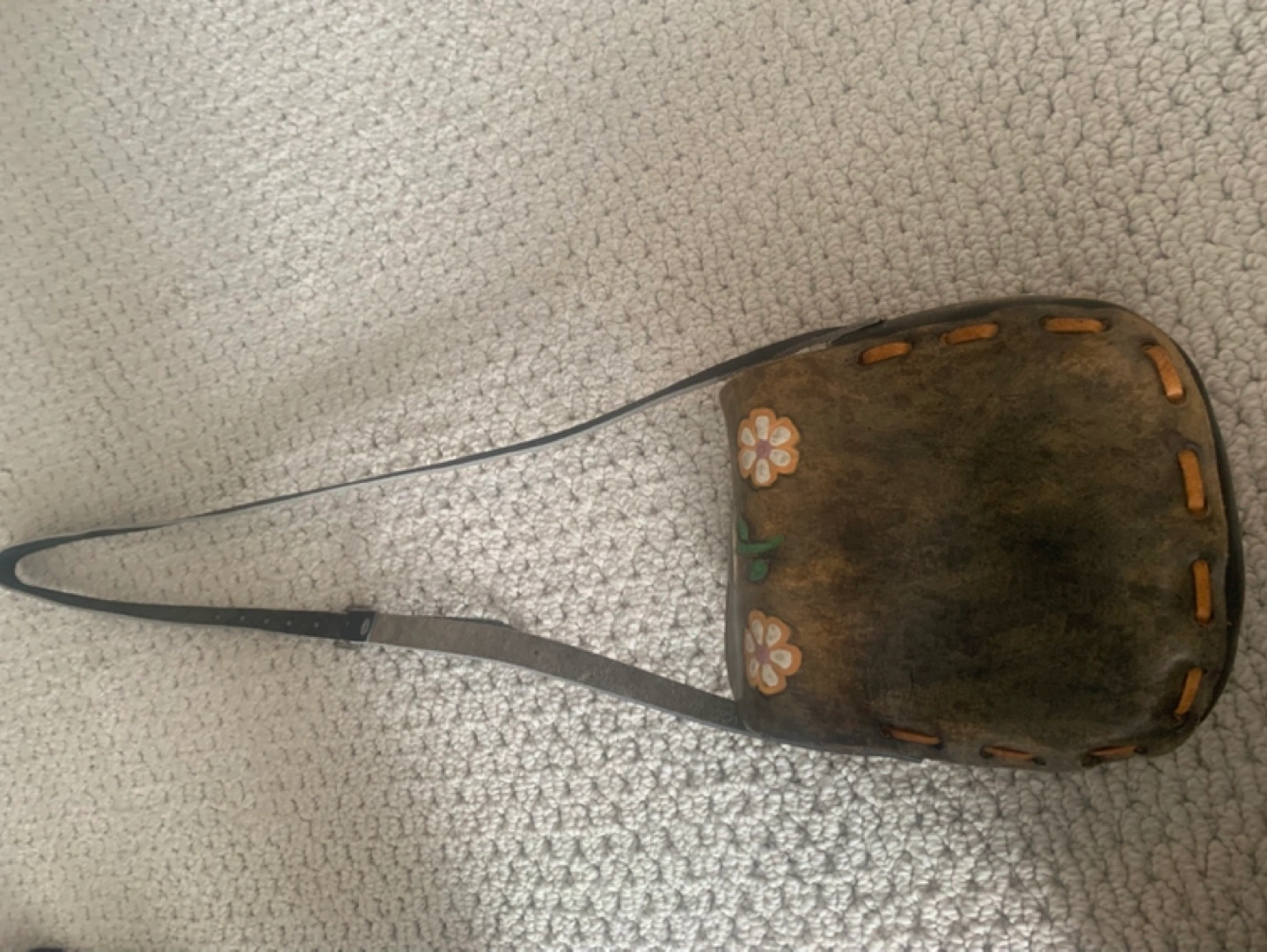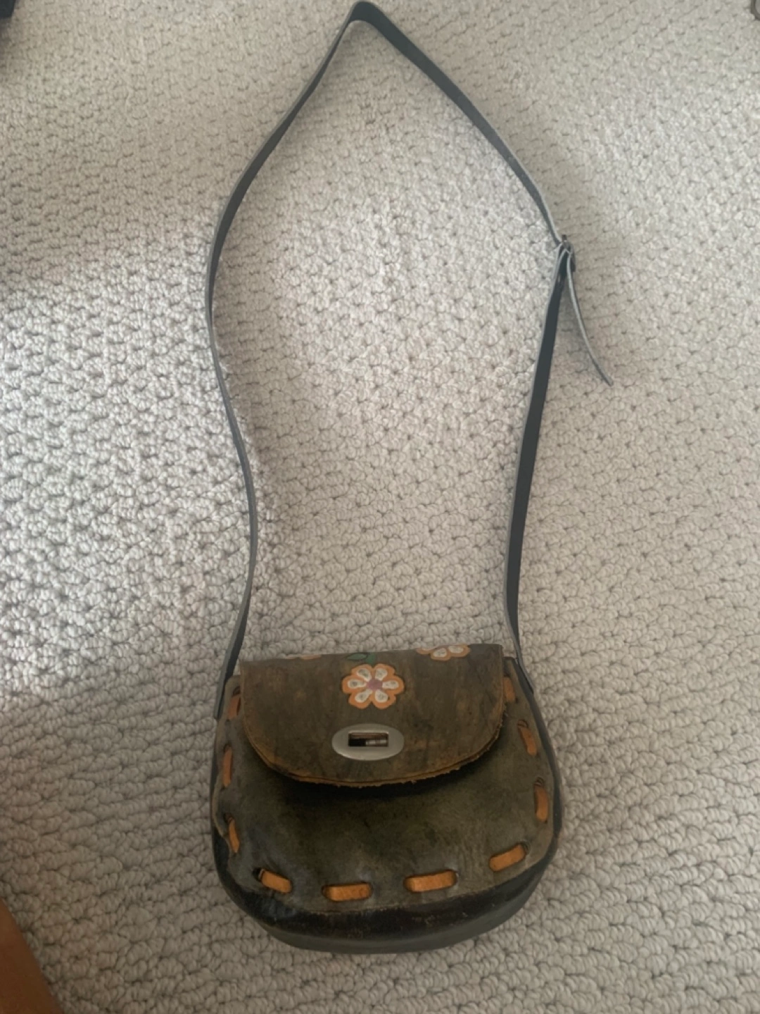 Small vintage crossbody bag. Features a dark greyish-brown leather exterior with embroidered flowers. Adjustable shoulder strap