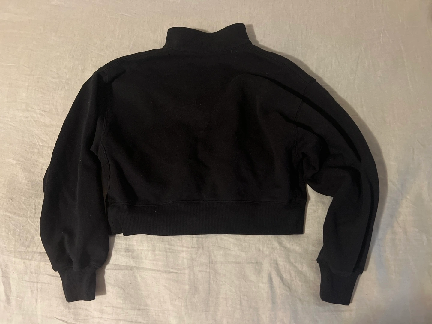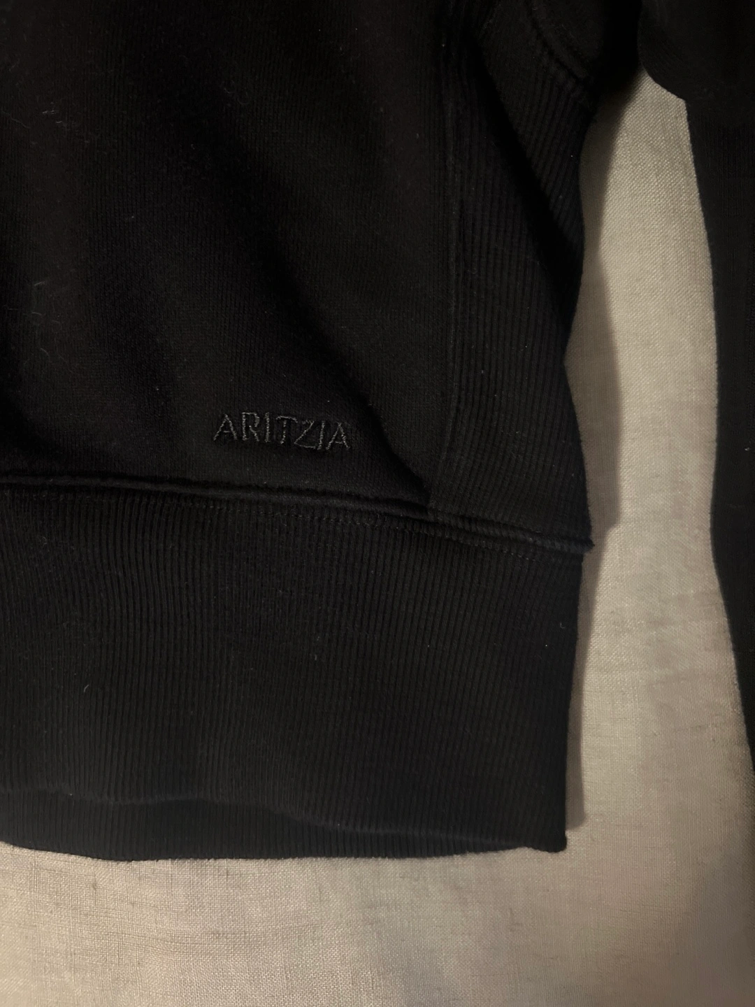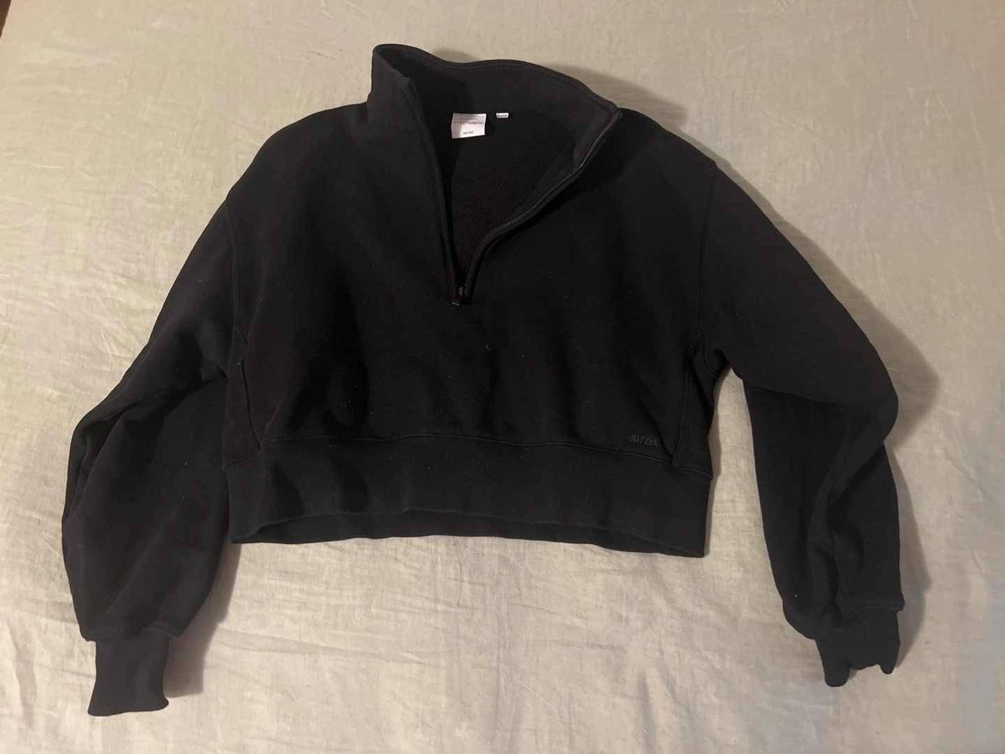 Black cropped half-zip sweatshirt. Size small. Cozy fleece material. Relaxed boyfriend fit. My lighting makes it looks faded but it’s not. Only worn and washed once. Has the newer aritzia branding and not the TNA.