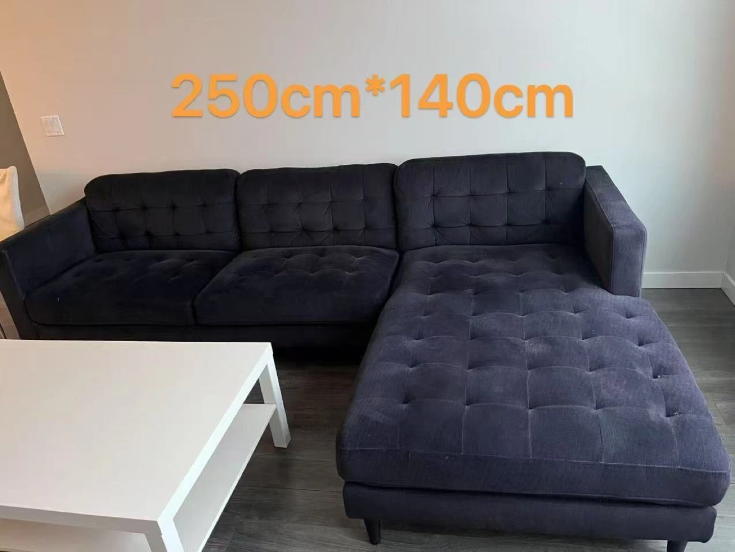 Large L-shaped sectional sofa. Dark grey fabric upholstery. Button tufting detail. Measures 250cm x 140cm. Good condition.