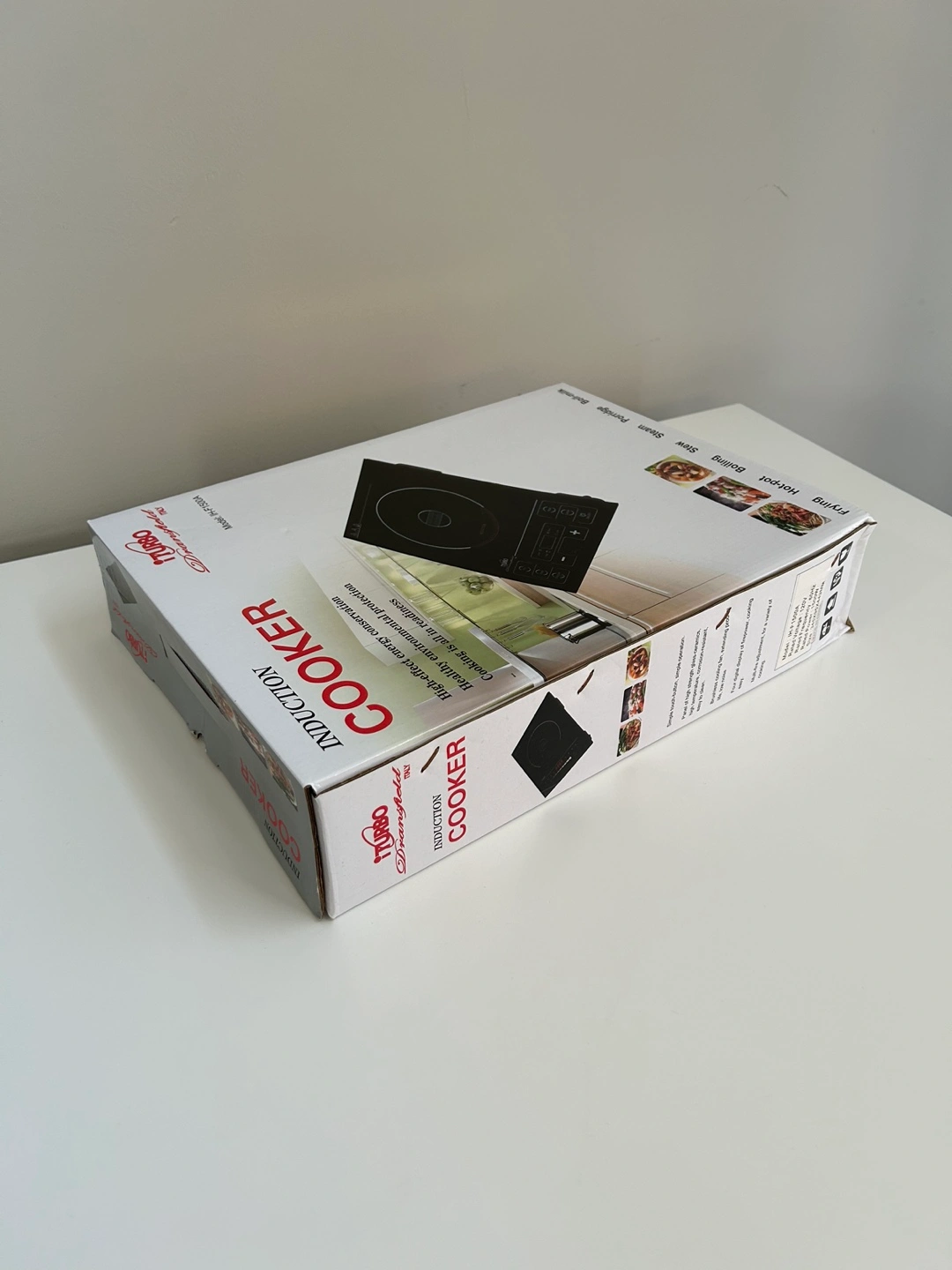 Portable single burner induction cooktop. Features include temperature and power controls, timer, and child lock. Includes instruction manual. Great for small spaces.