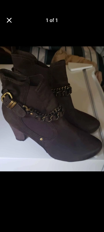 Pair of brown leather ankle boots. Features a chain detail and buckle accent. Block 3.5 inch heel & stretch sides. Size not written in boots but most likely 7.5 or 8, $15, pick up only, please see my other listings.