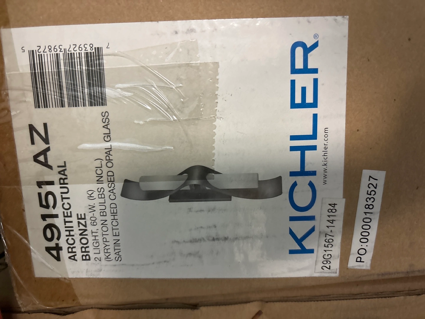 New in box. Bronze finish. Includes two 60-watt krypton bulbs. Satin etched cased opal glass. Model 49151AZ.