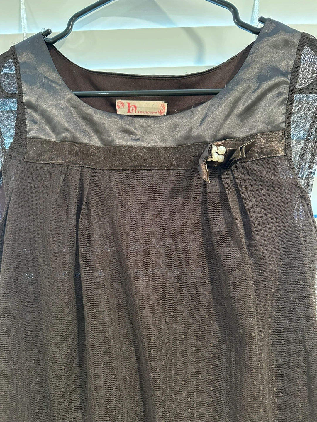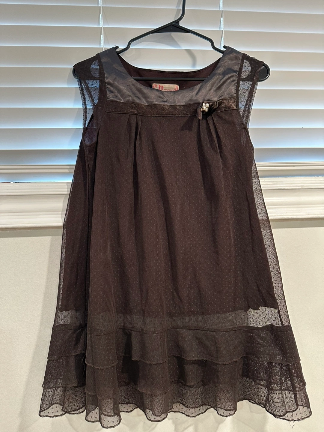 71Dark brown sleeveless girls’ dress. Sheer mesh overlay with Swiss dot pattern. Satin yoke. Layered ruffle hem. Size 1.