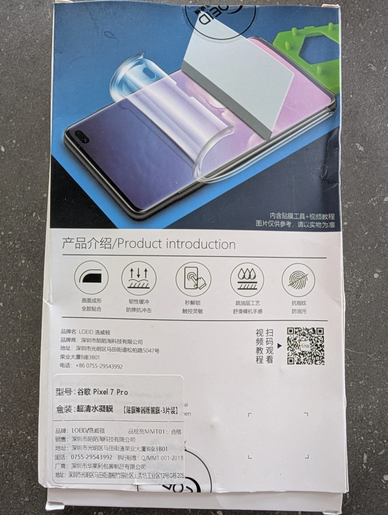 Screen protector for Google Pixel 7 Pro. Includes installation tools and instructions. Features include full adhesive coverage, shock absorption, and fingerprint resistance.