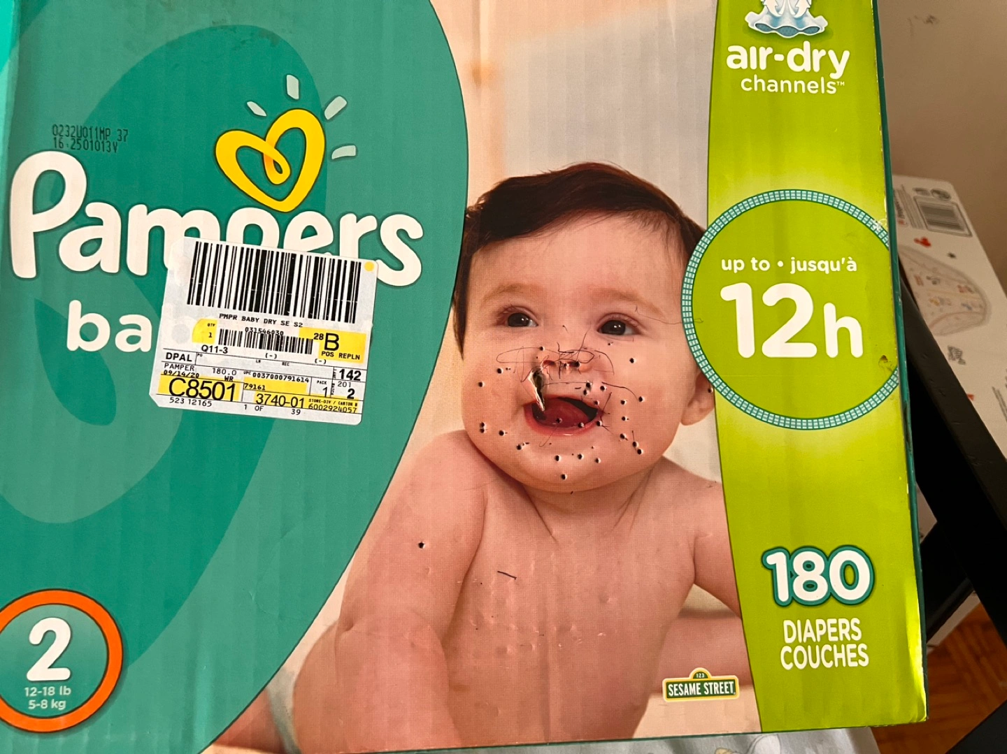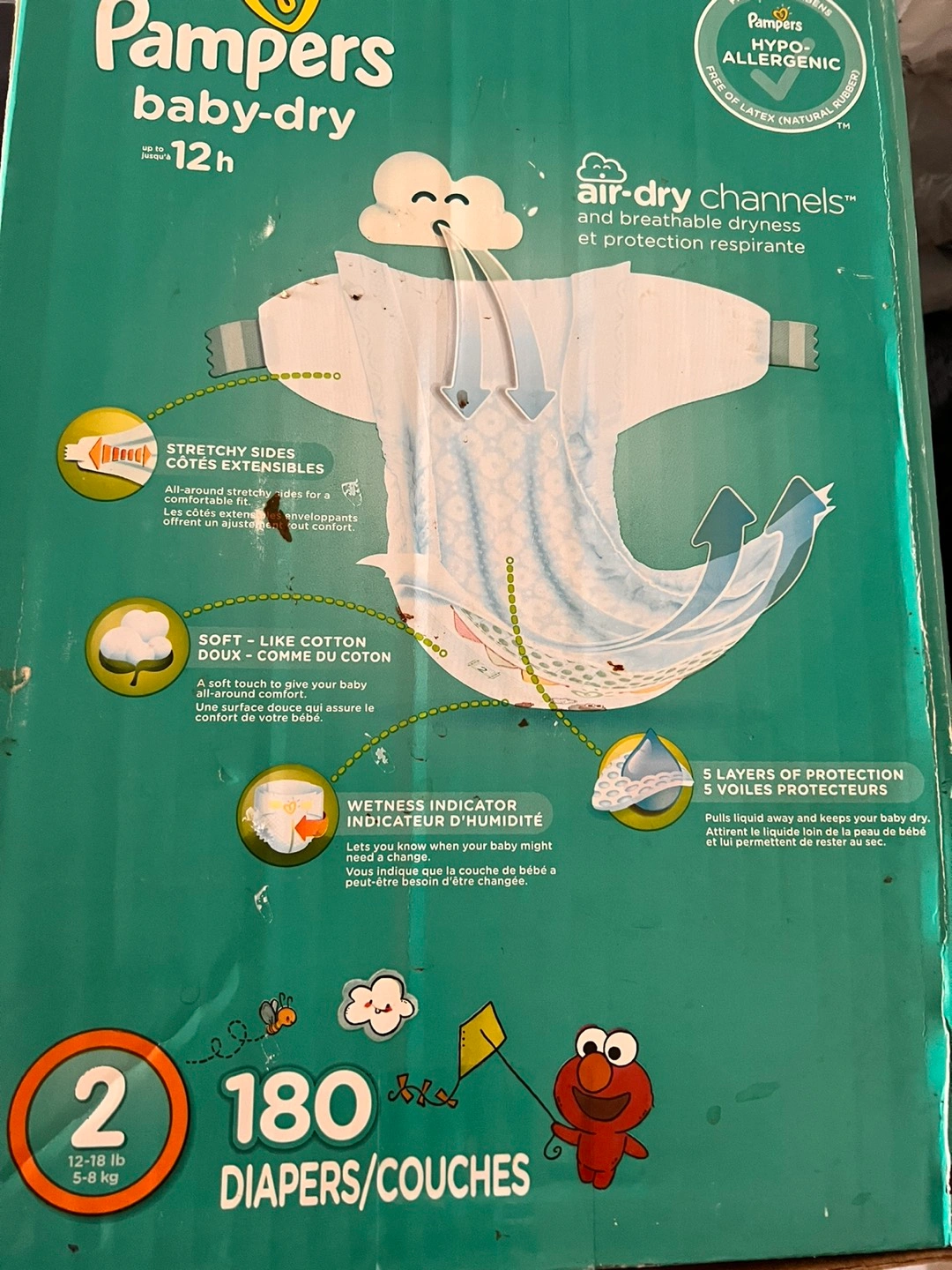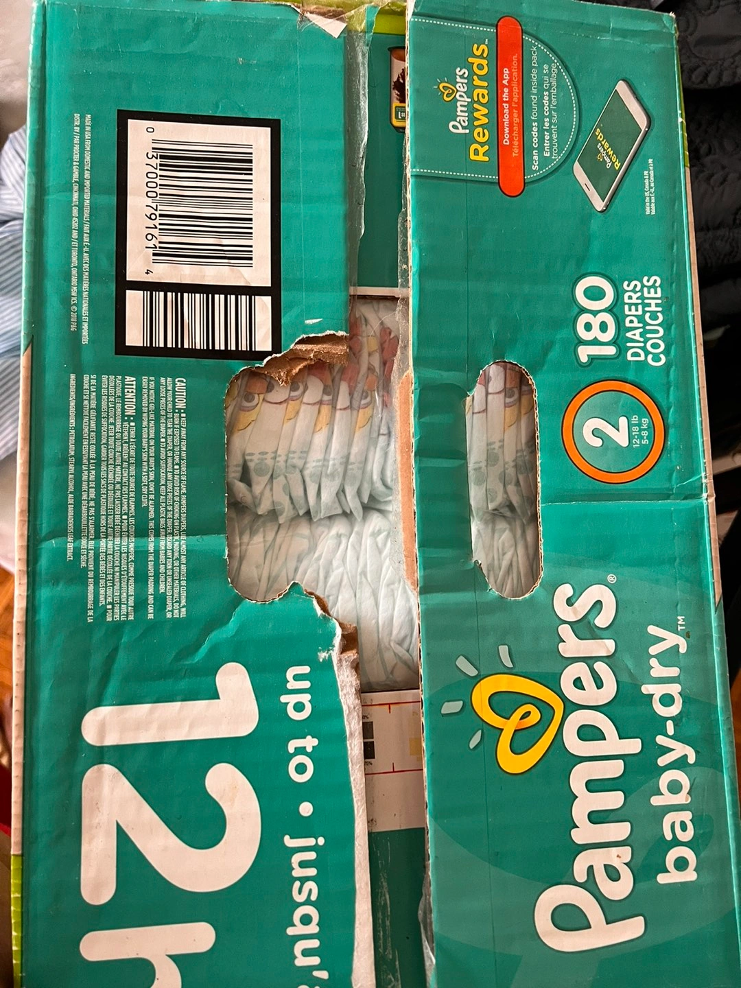 The handle of the box is cut by my kids and the ink spots deco ππ. The diapers are intact inside; never opened.
