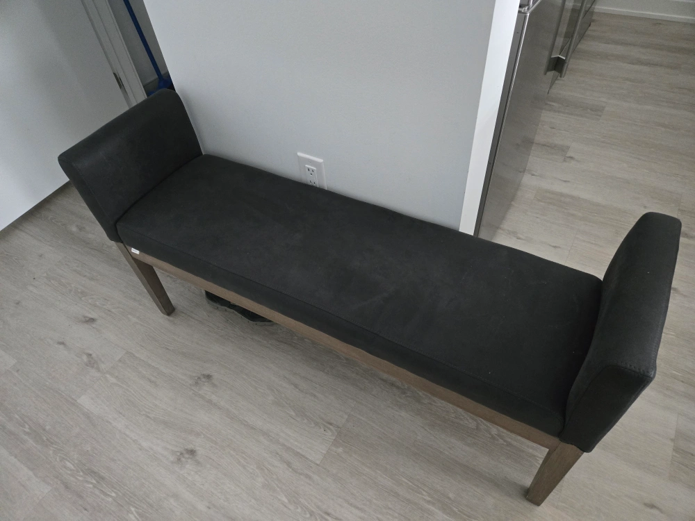 Modern bench, dark black fabric, wood legs. Provides shoe storage underneath. Good condition.Like new suede fabric confortable. Like new moving Asking 60