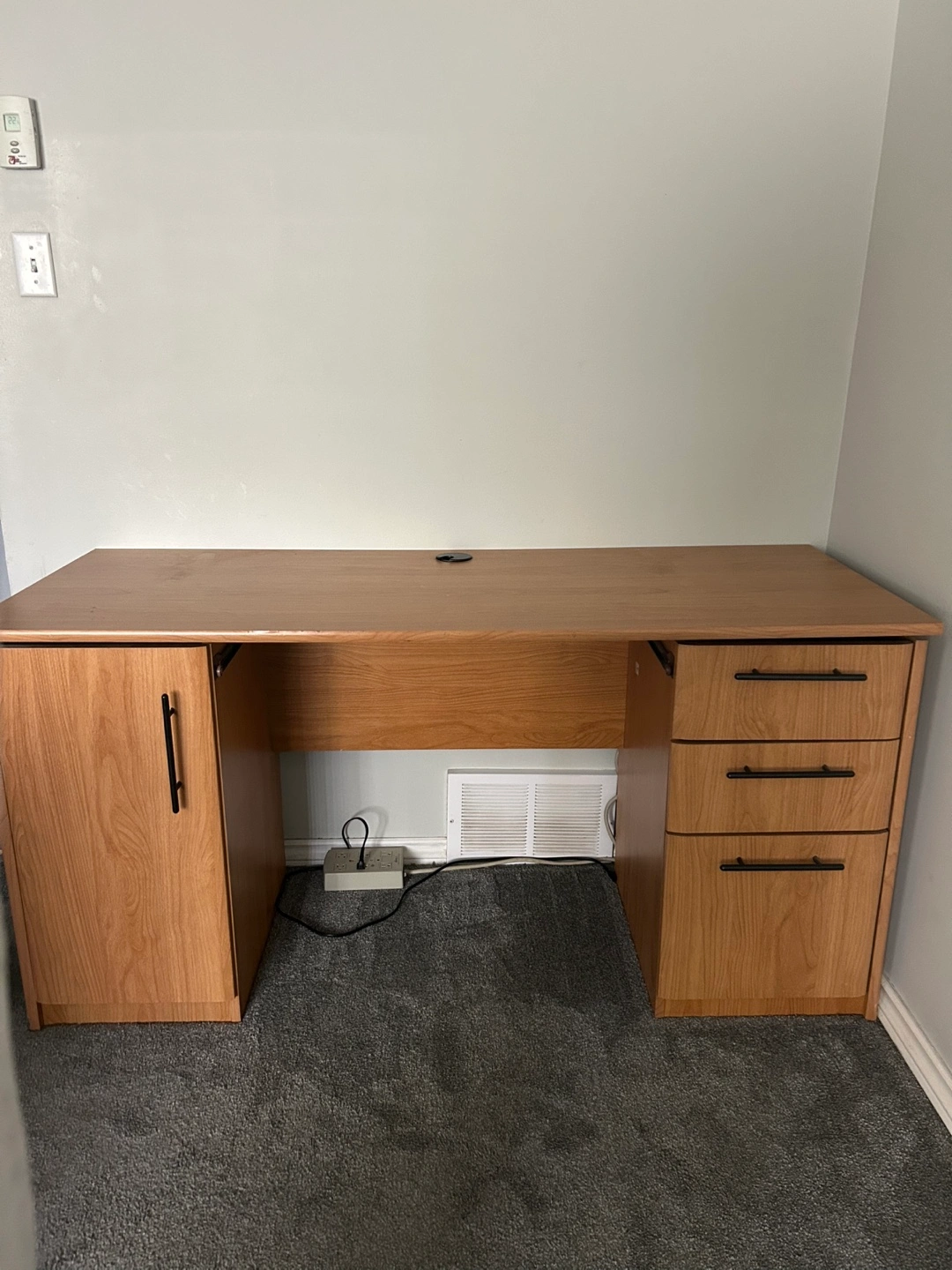 Spacious writing desk. Features two cabinets and three drawers. Black metal hardware. Good for home office or workspace, stable, large, roomy.