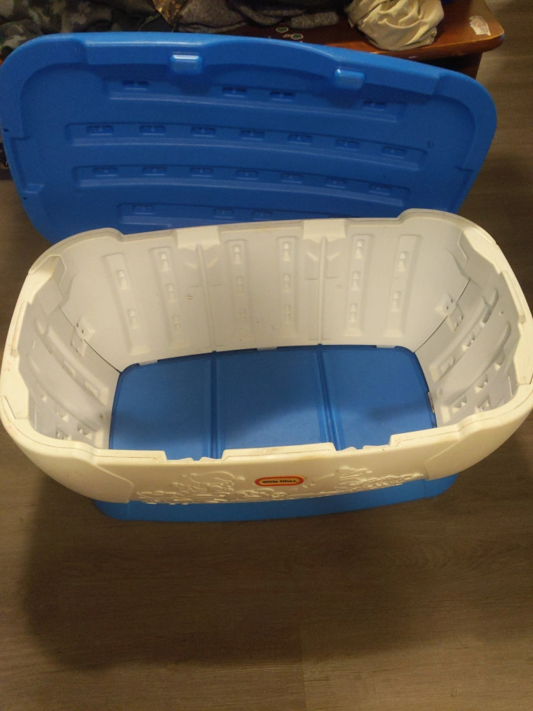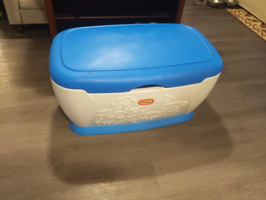 Large plastic toy chest. Blue lid and accents. White body. Great for storing toys or other items. Shows some minor wear. don't need it anymore don't wanna throw in the garbage when someone can use this please pm if interested pick up only