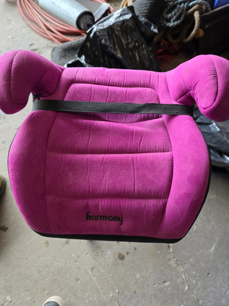 Used kids booster car seat. Purple fabric. Good condition. Includes vehicle seat belt. Easy to clean.