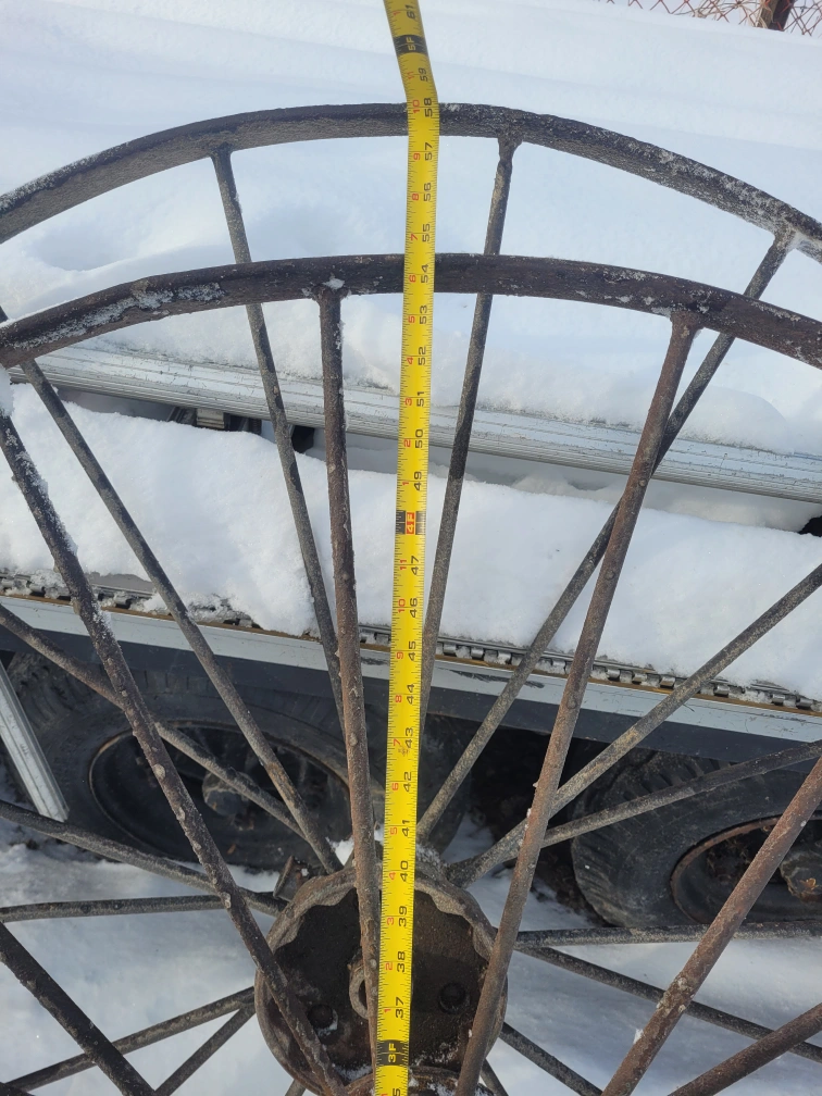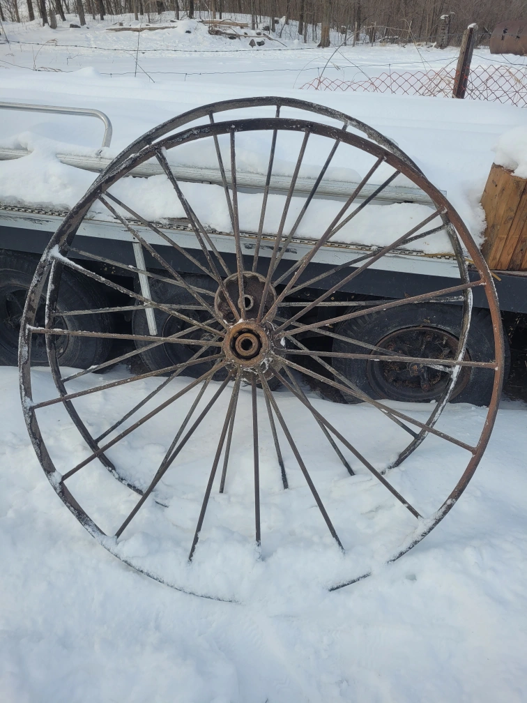 Show allPair of antique wagon wheels. Metal construction. Shows wear consistent with age and outdoor use. Great for farmhouse decor or rustic projects. Measures 54 inches in diameter.