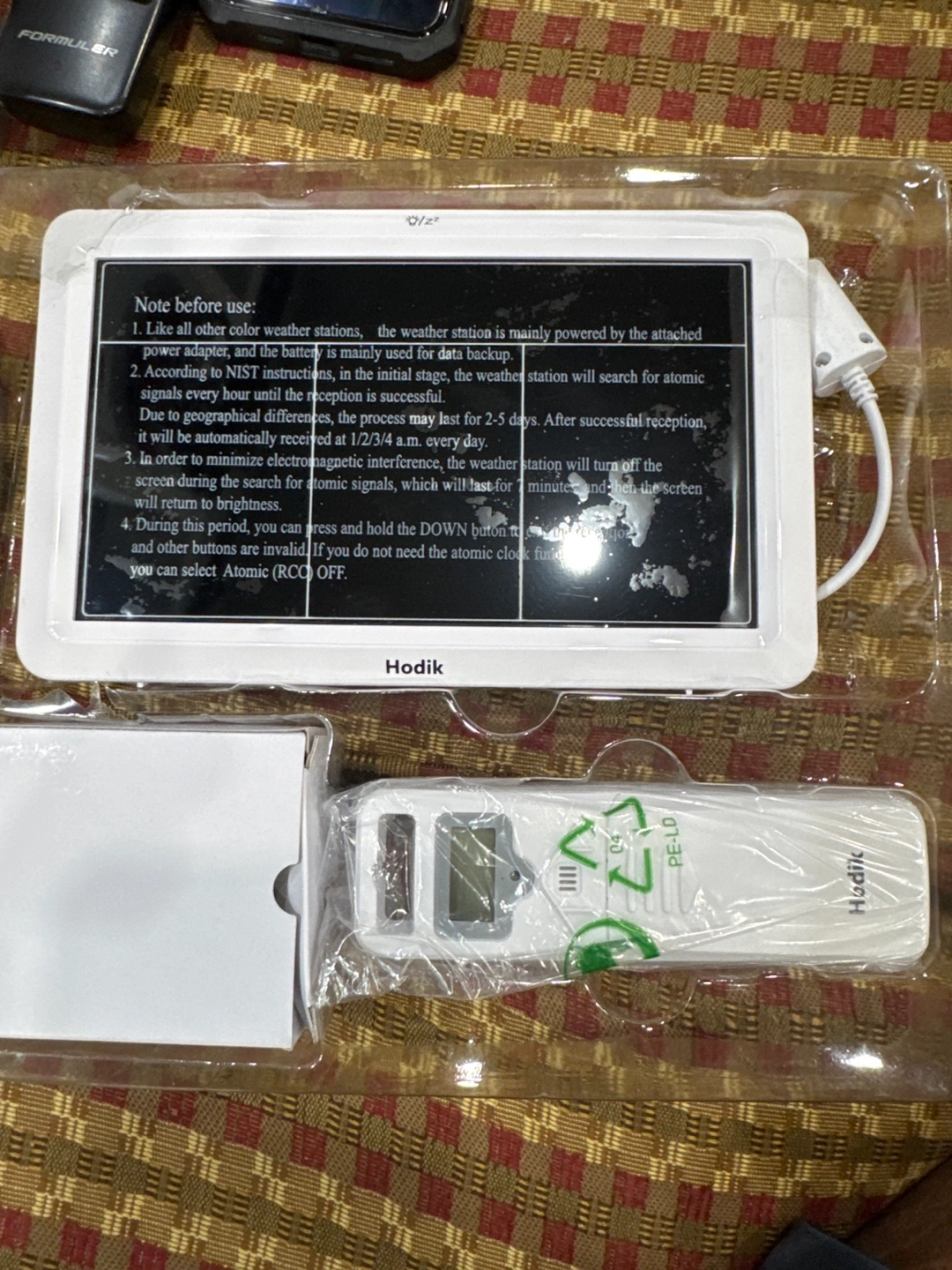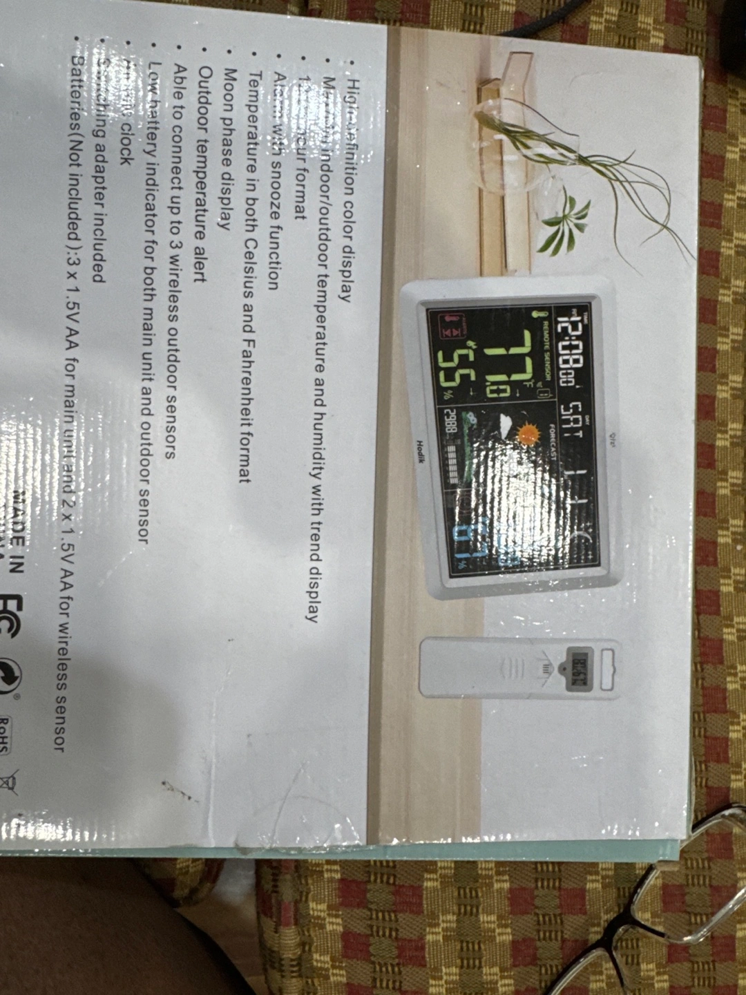 20Indoor/outdoor temperature and humidity. Atomic clock function. Features Fahrenheit/Celsius. Displays time, date, temperature, and humidity. Wireless outdoor sensor included. Colour display. Requires 3x AAA batteries (not included).