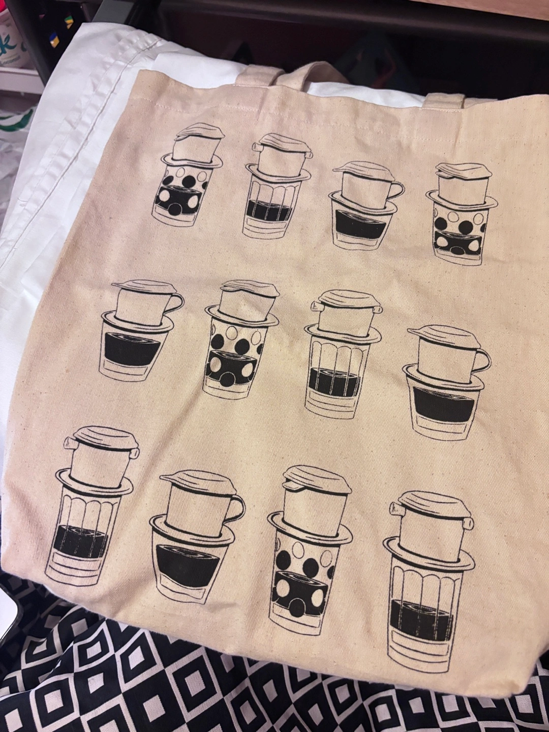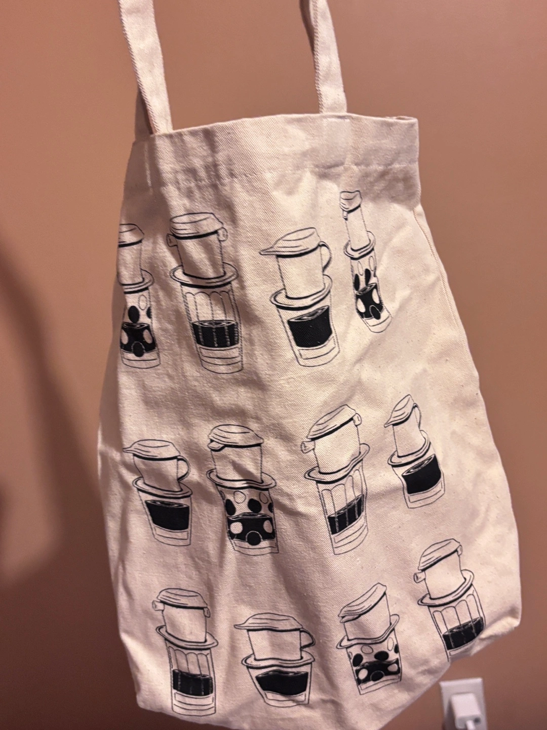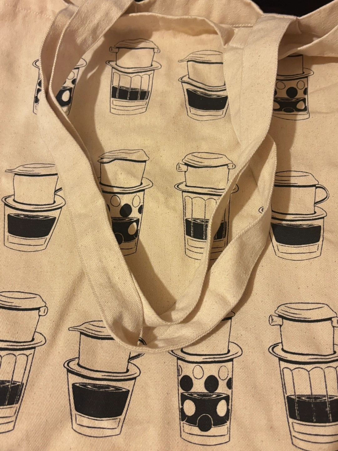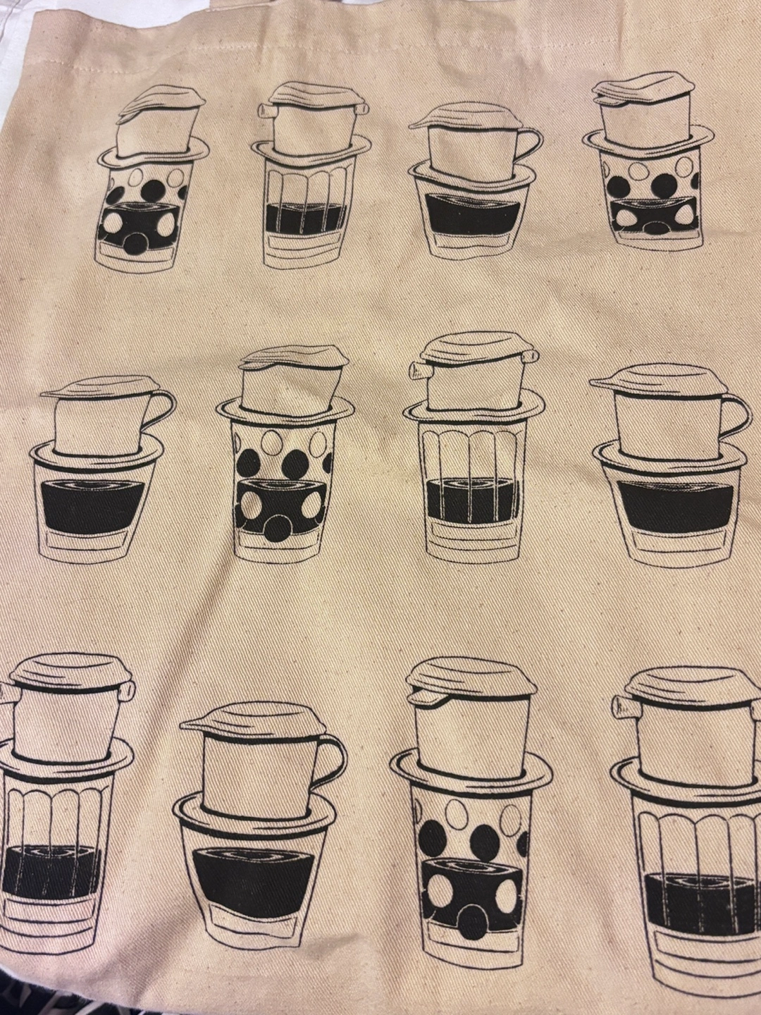 Beige canvas tote bag. Features a repeating pattern of black and white illustrations of Vietnamese coffee brewing apparatus. Two long handles. Great for shopping or carrying everyday essentials.