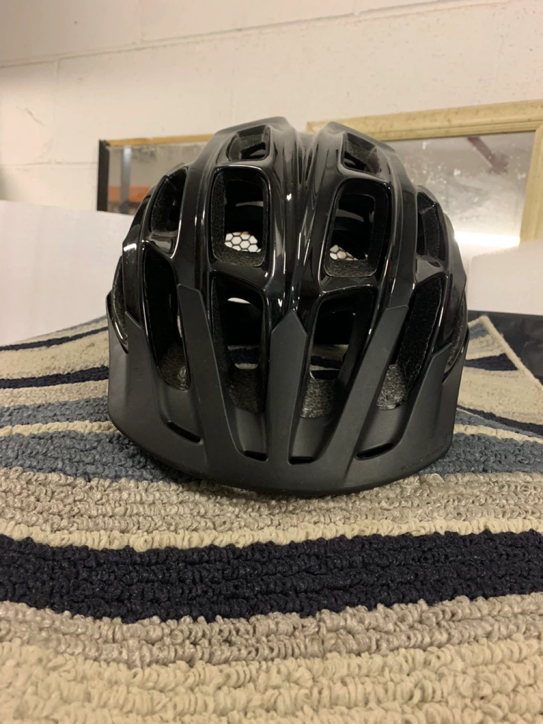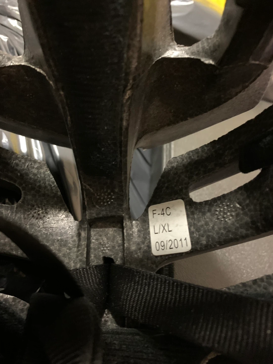 This is a black FDX cycling helmet in L/XL size. It features a black, glossy finish and multiple vents for airflow. Manufactured in September 2011.
