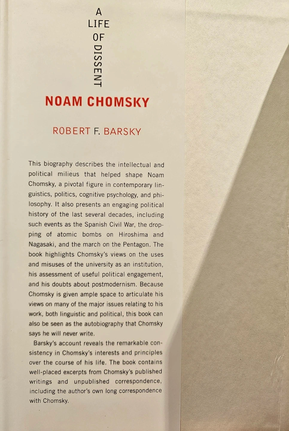 This is 'Noam Chomsky: A Life of Dissent' by Robert F. Barsky. It's a biography exploring Chomsky's life and work. The book includes extensive research and insights into his political and linguistic theories.