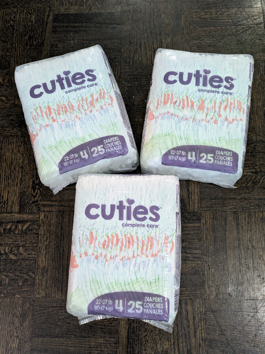 I have three packs of Cuties Complete Care diapers, size 4 (22-37 lb or 10-17 kg). Each pack contains 25 diapers. Perfect for your little one!