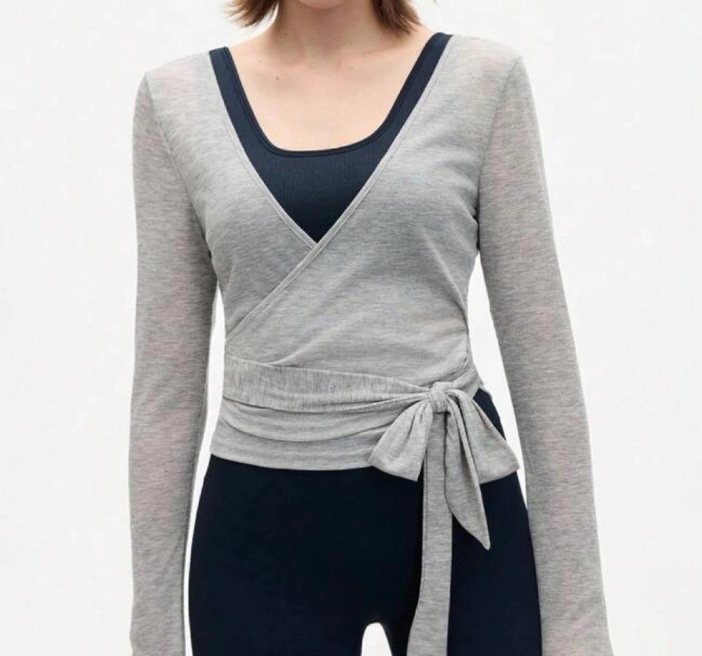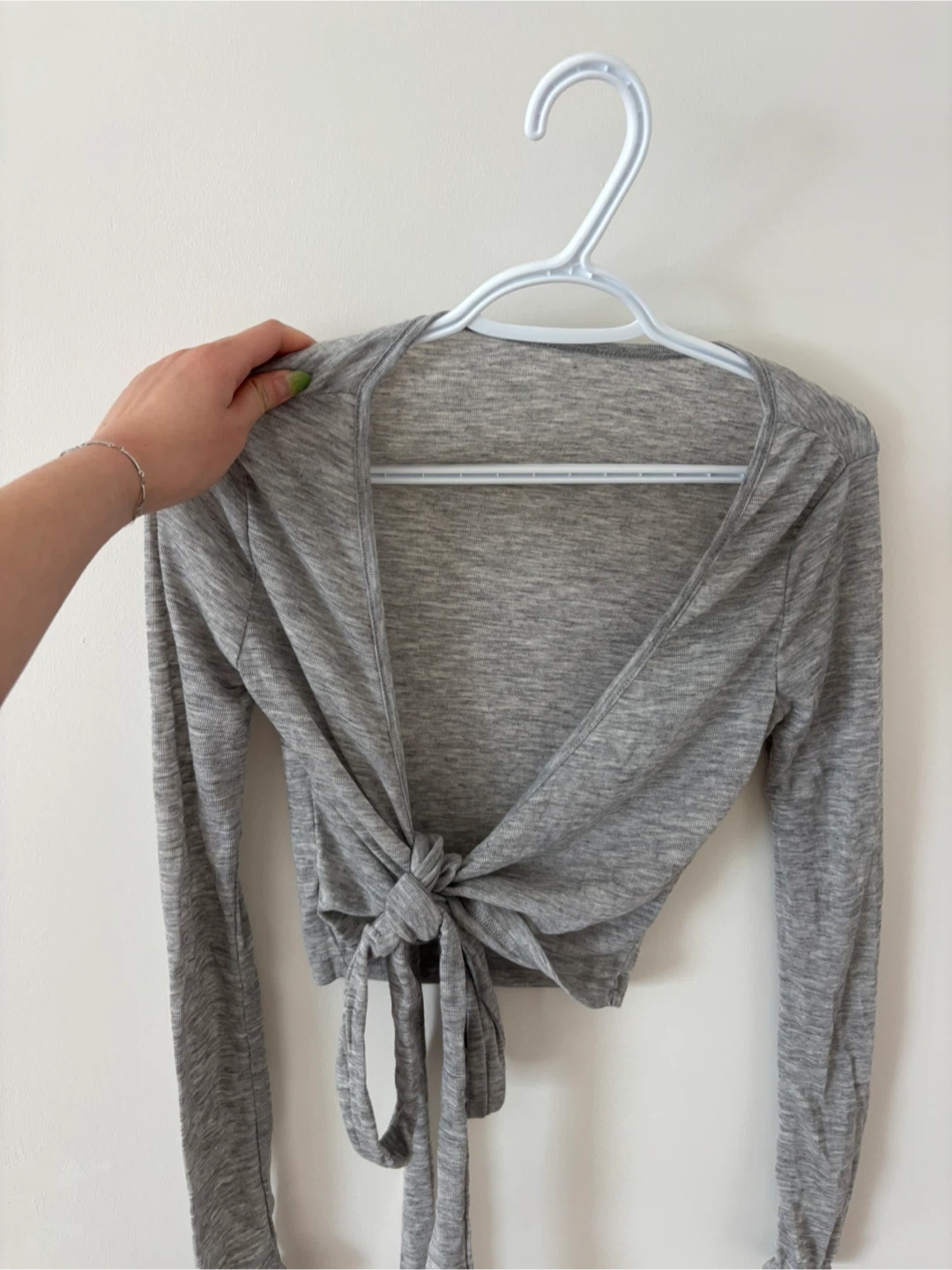 A lightweight grey long-sleeved wrap top. It features a tie closure at the waist. Made from a soft, stretchy fabric.