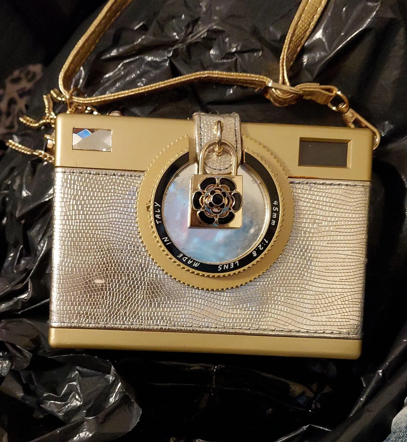 This unique clutch bag is designed to look like a vintage camera. It features a gold finish with textured detailing and a decorative clasp. A stylish accessory for a night out!