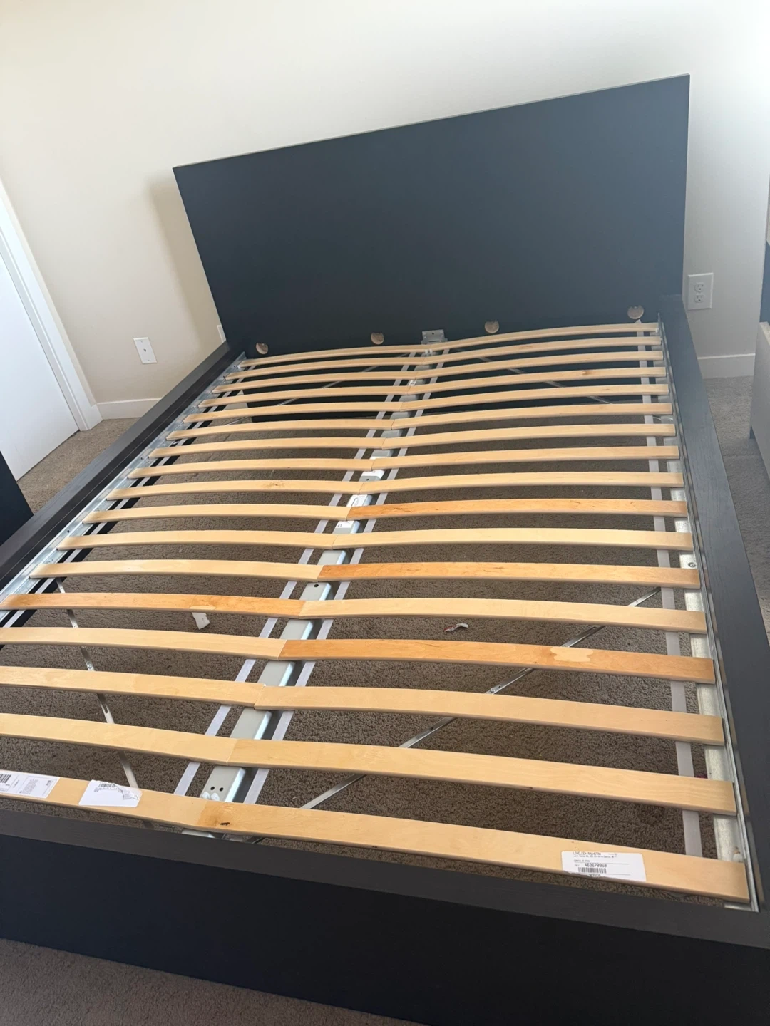 King size bed frame in a dark brown finish. It features a solid headboard and a wooden slat support system for the mattress. This frame offers a modern look for any bedroom.