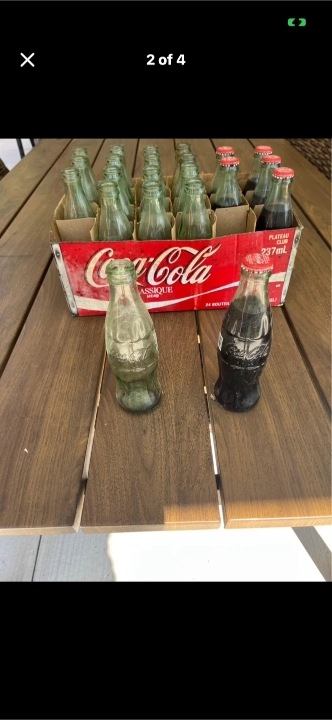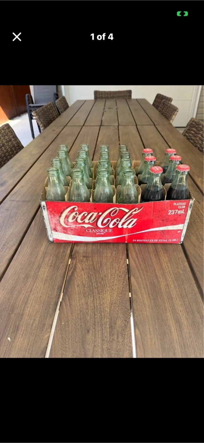 This listing includes a vintage Coca-Cola Classic crate with 24 empty glass bottles. Each bottle has a 237ml capacity. The crate shows signs of wear consistent with its age.