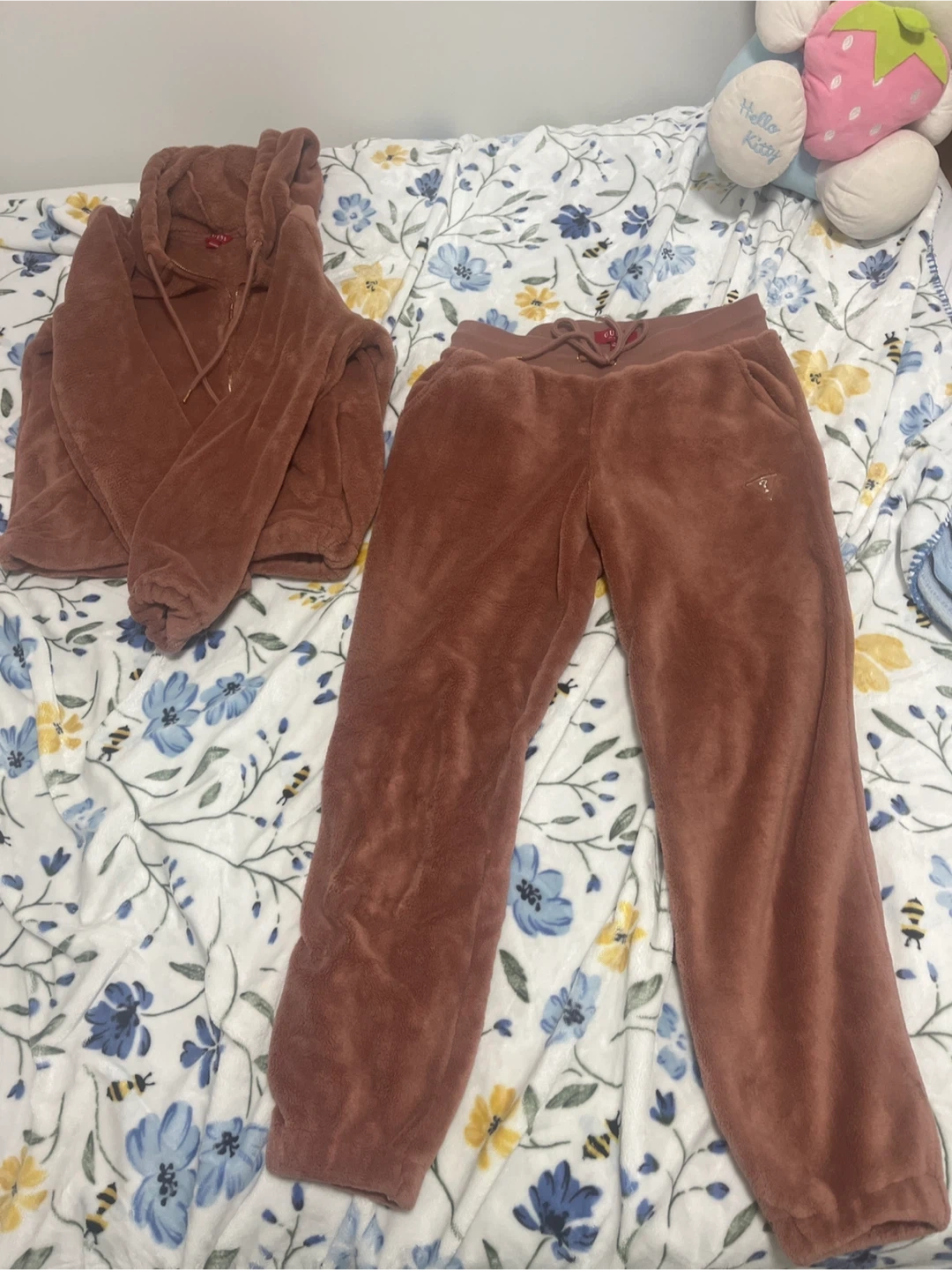 Cozy Guess velour hoodie and matching joggers. Soft plush material. Perfect for loungewear! Pick up cash only