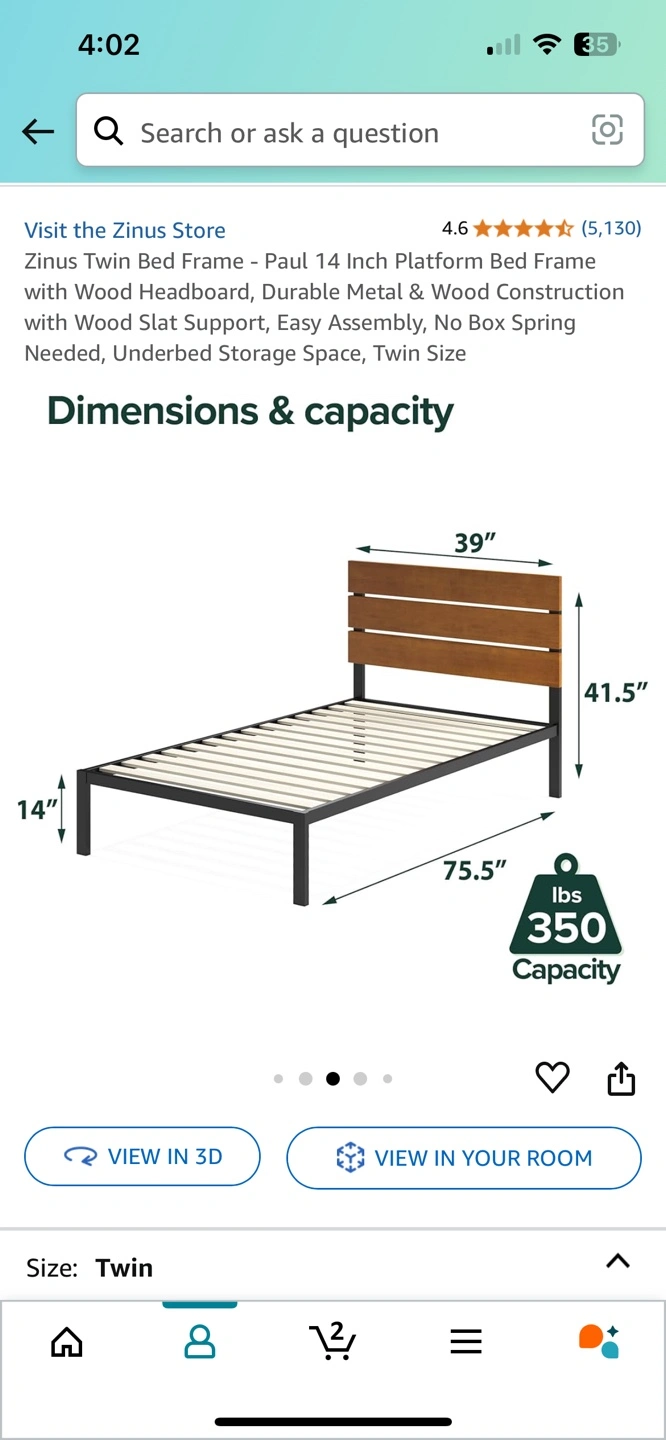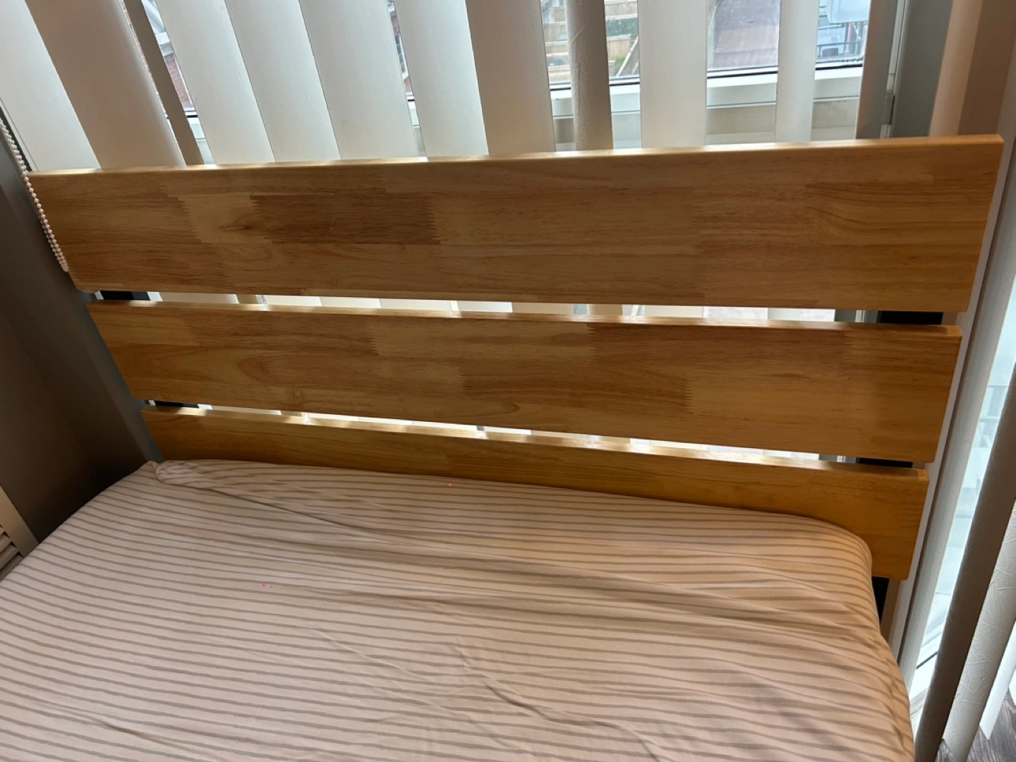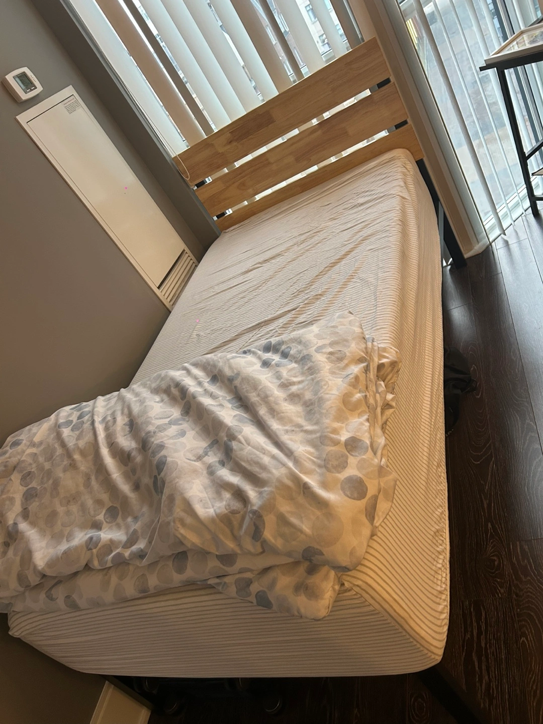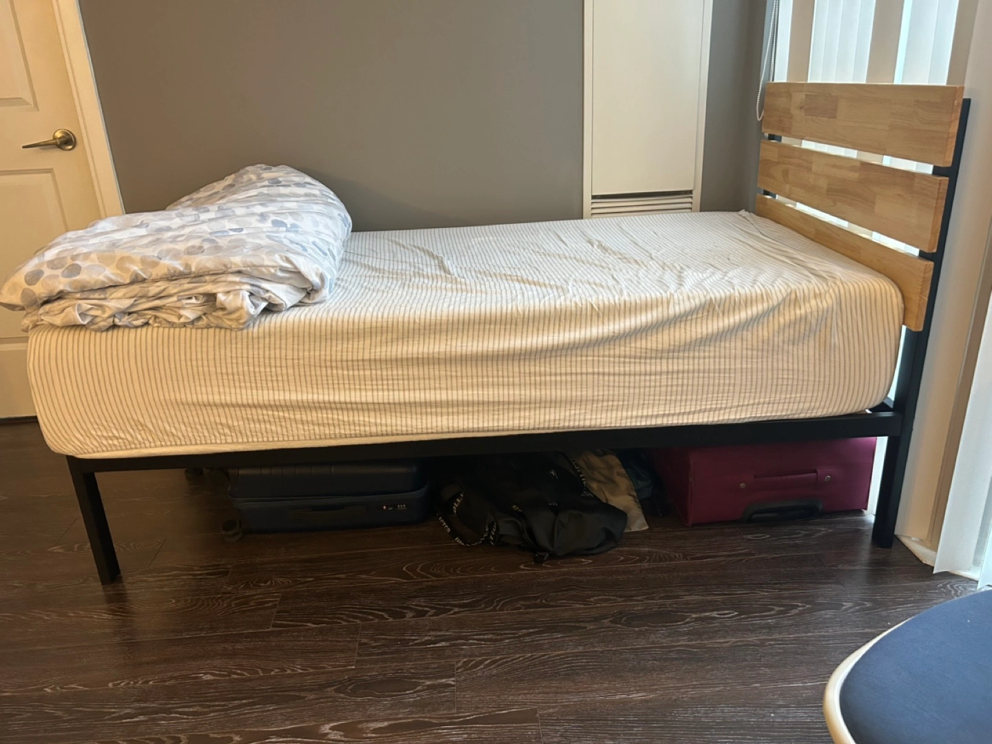 Zinus Twin bed frame with headboard. Durable metal and wood construction. Easy assembly. No box spring needed. Underbed storage space. Very Good condition. Memory foam mattress included (used less than 6 months)