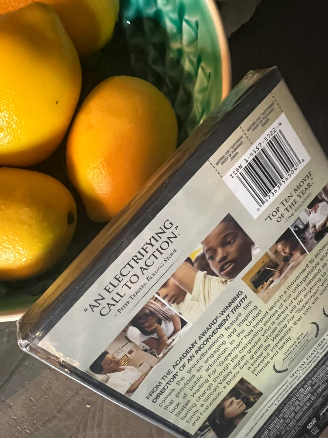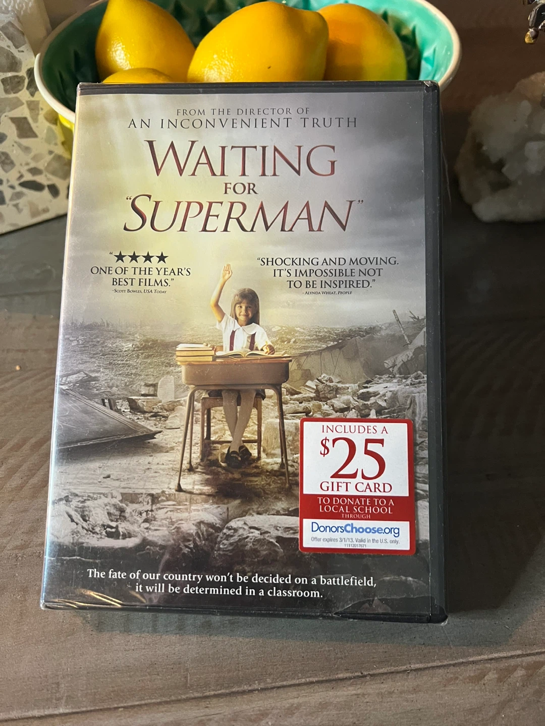 Selling a DVD copy of "Waiting for Superman" that includes a $25 gift card to donate to a local school through DonorsChoose.org. The gift card expired on 2023 March 31.