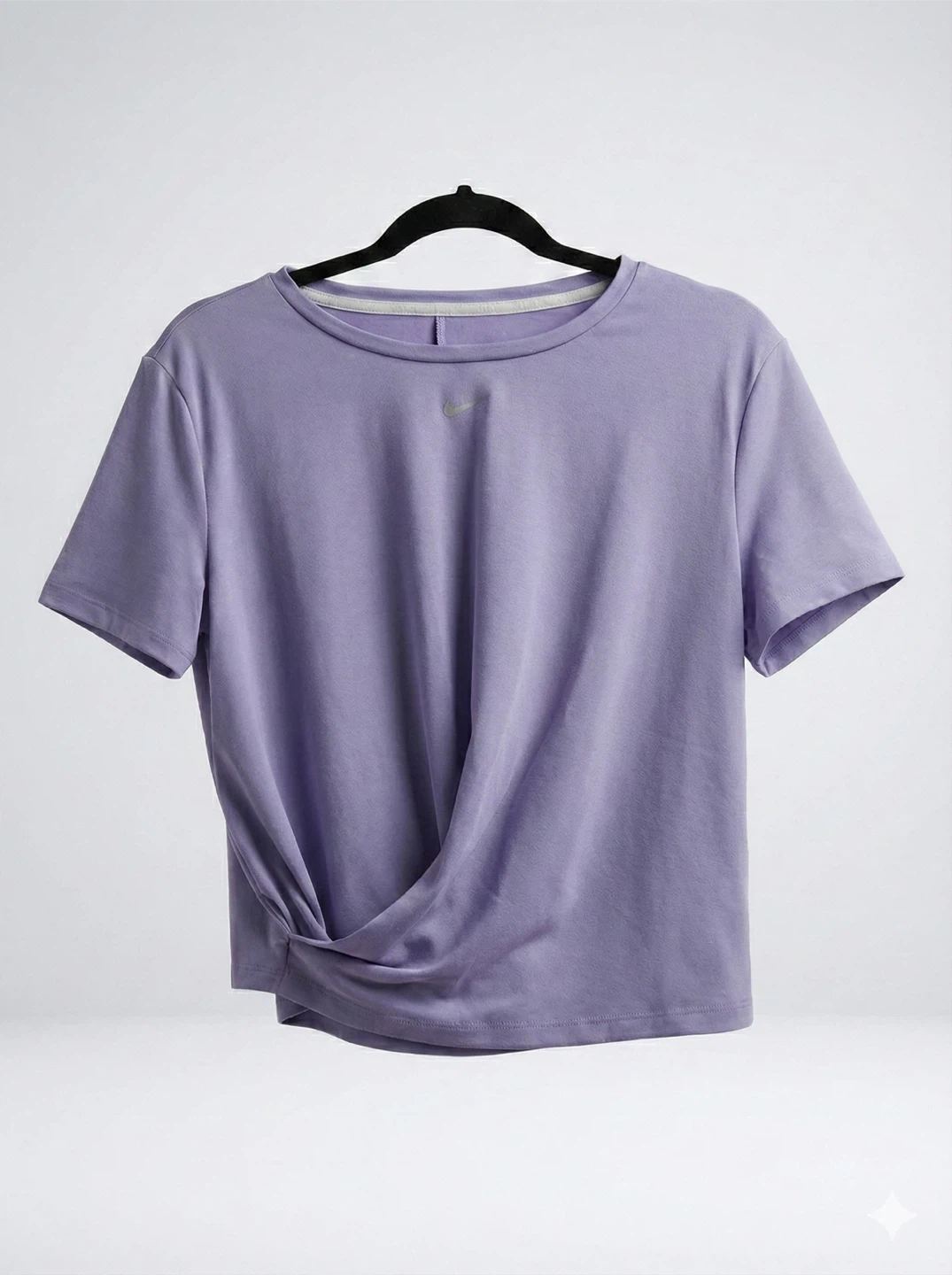 This Nike t-shirt comes in a soft lavender colour with a stylish twist front detail. It's made from a lightweight, breathable fabric, perfect for workouts or casual wear. The cropped style offers a modern silhouette.
