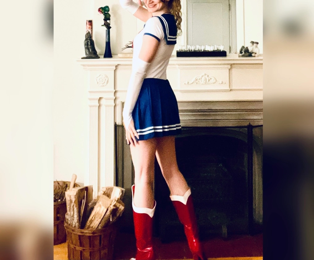 A sailor-style costume with a blue skirt white top dress medium size. Comes with gloves, boots size 9 and hair extensions.