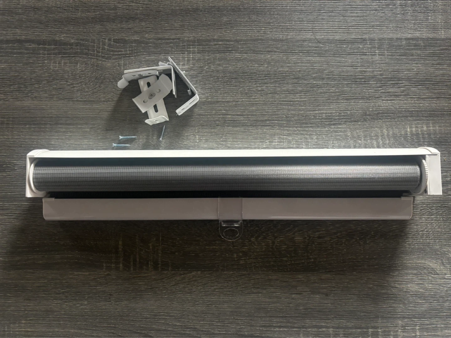 White zebra roller blind shade, 21 inches wide. Includes mounting hardware and screws. Offers privacy and light control with alternating sheer and opaque stripes.