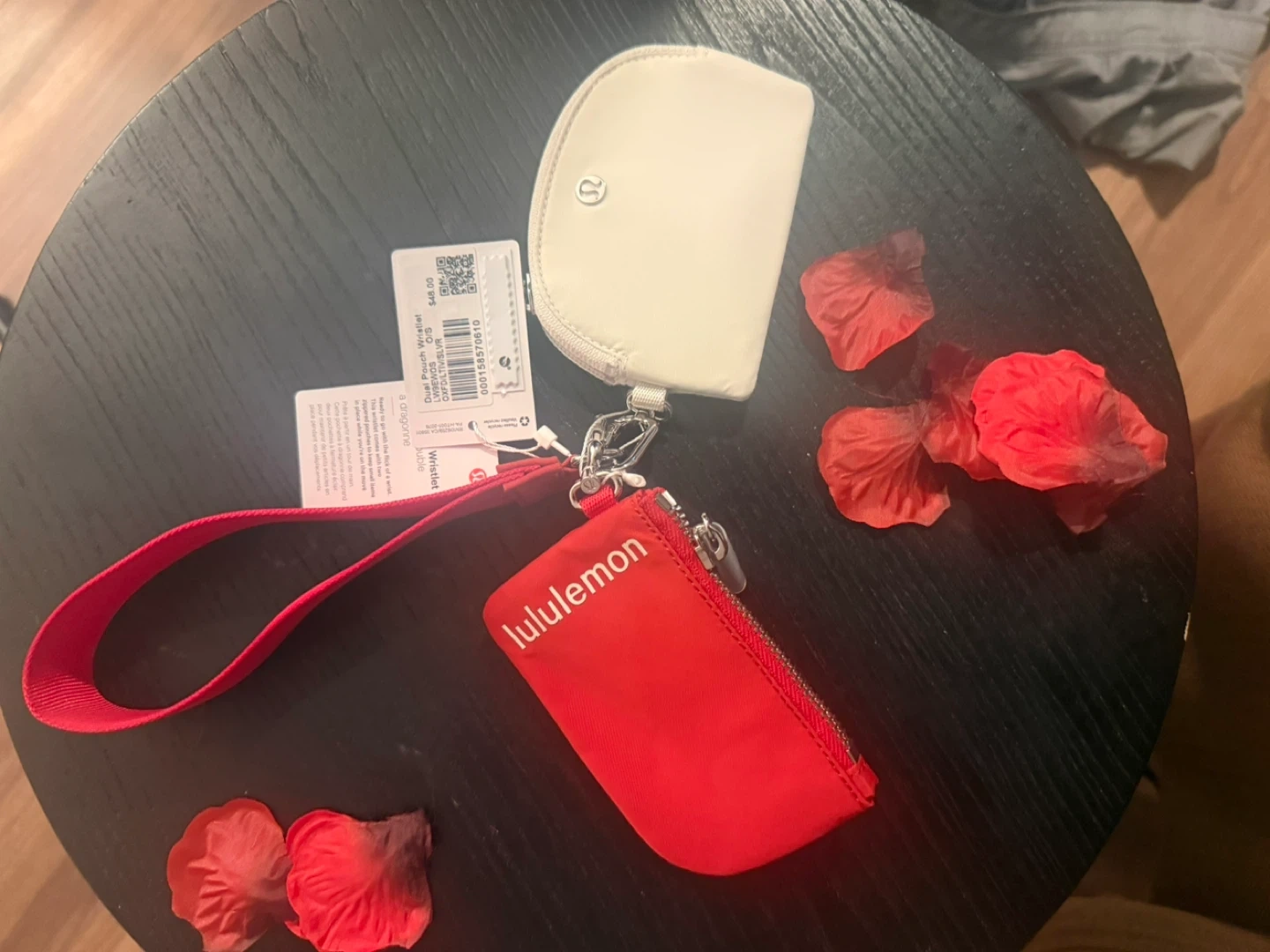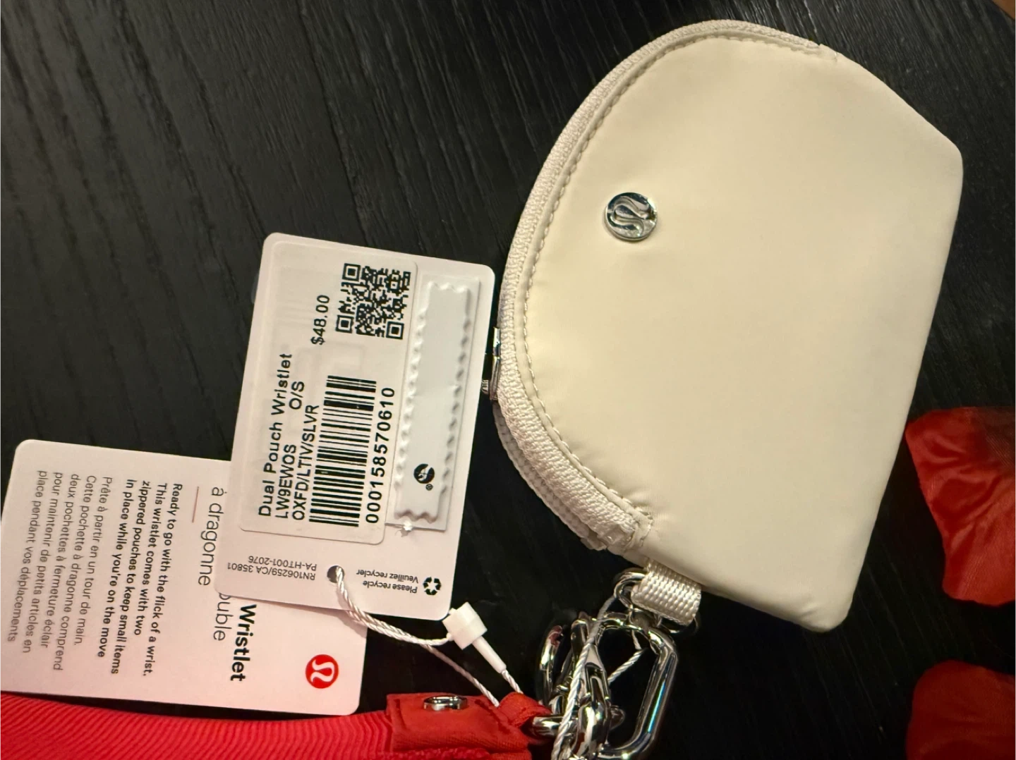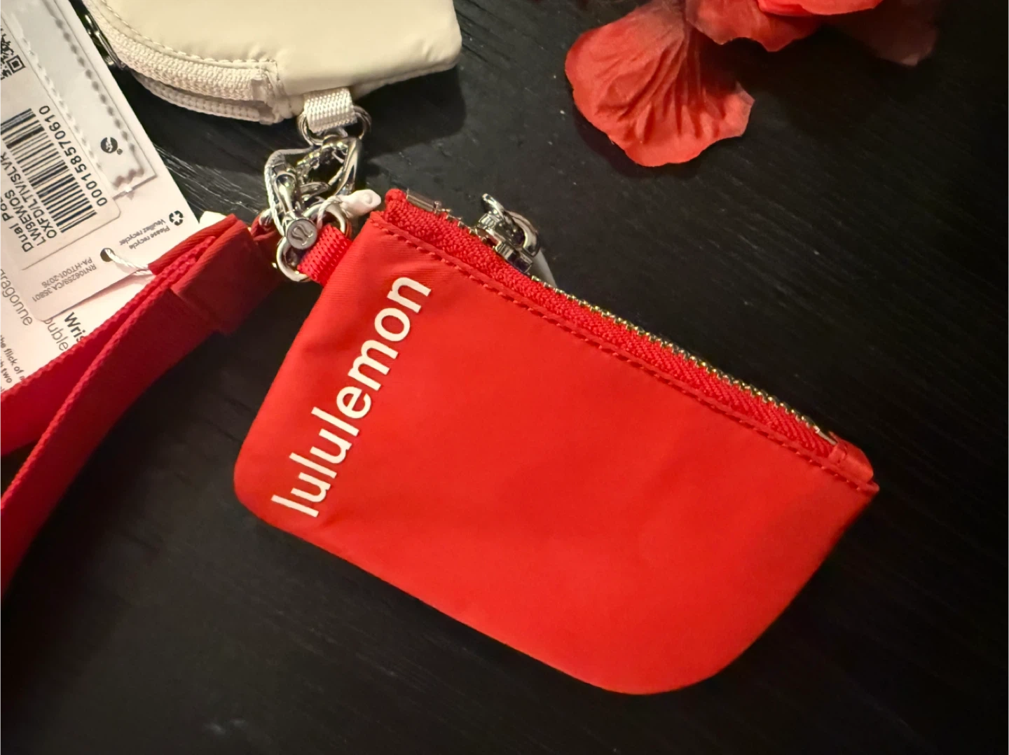 This Lululemon Dual Pouch Wristlet comes in red and cream. It's designed to go with the flick of a wrist and has two zippered pouches for small items. Perfect for keeping essentials handy on the go!