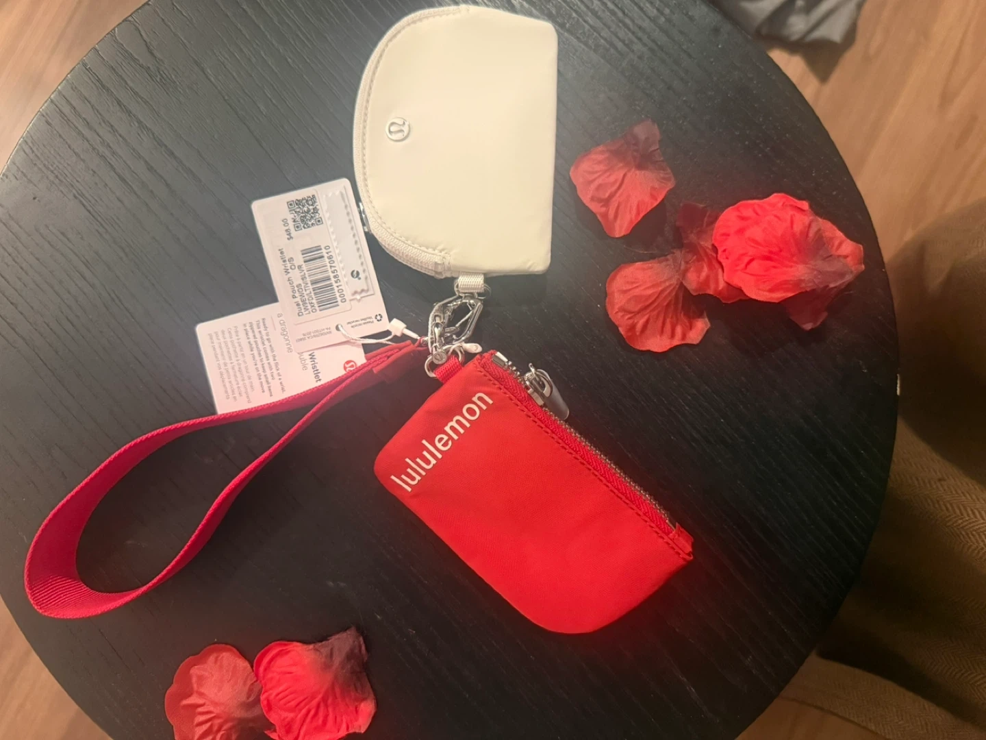 This Lululemon Dual Pouch Wristlet comes in red and cream. It's designed to go with the flick of a wrist and has two zippered pouches for small items. Perfect for keeping essentials handy on the go!