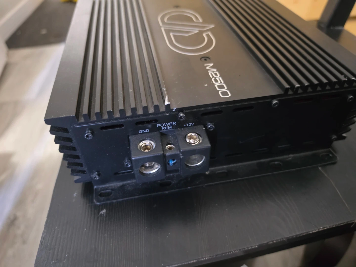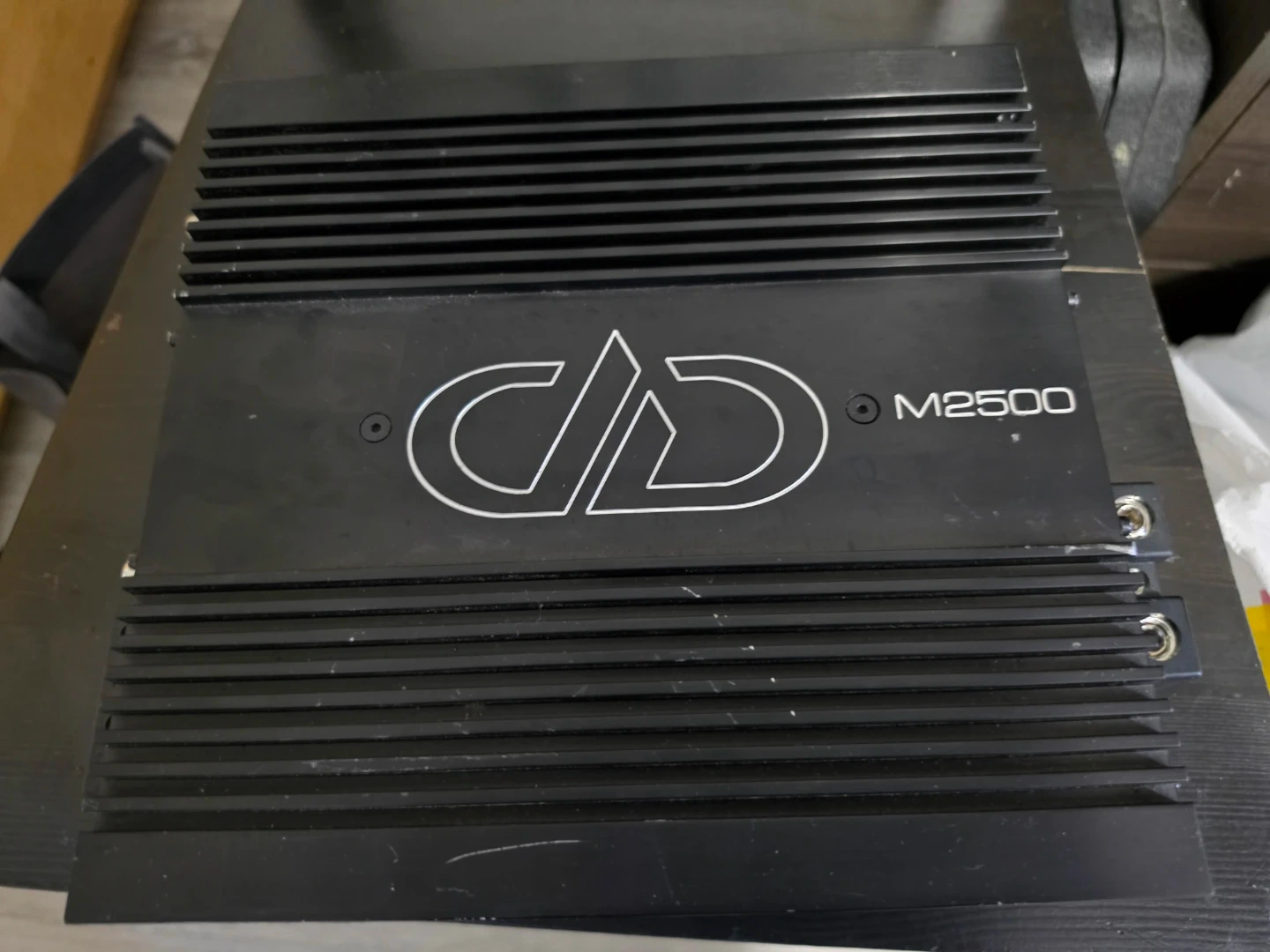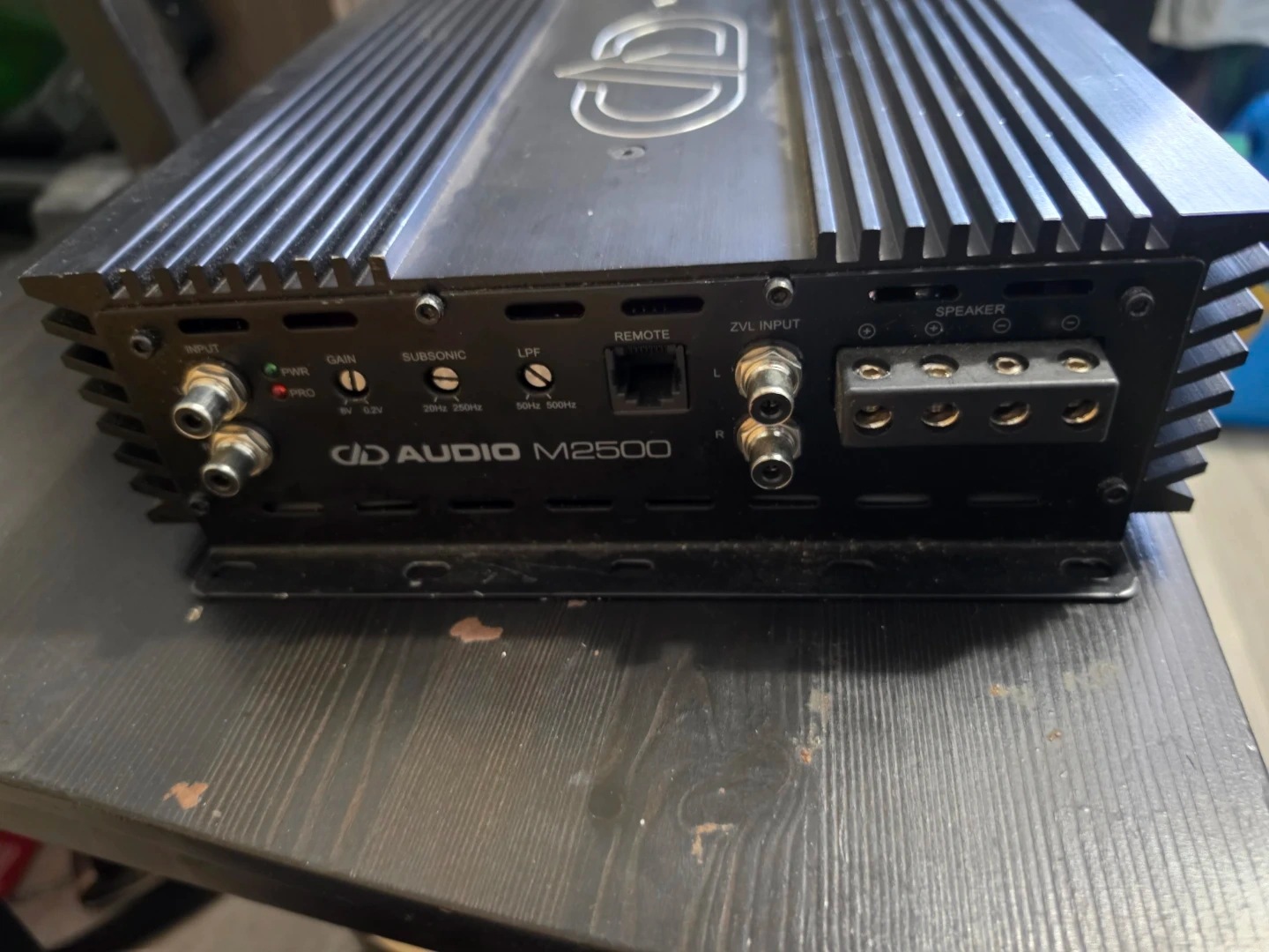 This is a DD Audio M2500 amplifier. It features various input and output connections. This unit is made in Korea.