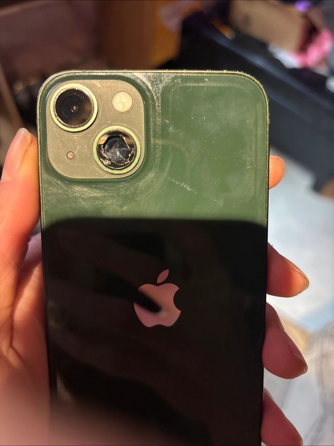 Pre-owned iPhone 13 in Midnight Green. Minor wear and tear. One camera is damaged and the Screen is in okay condition. Still works fine.